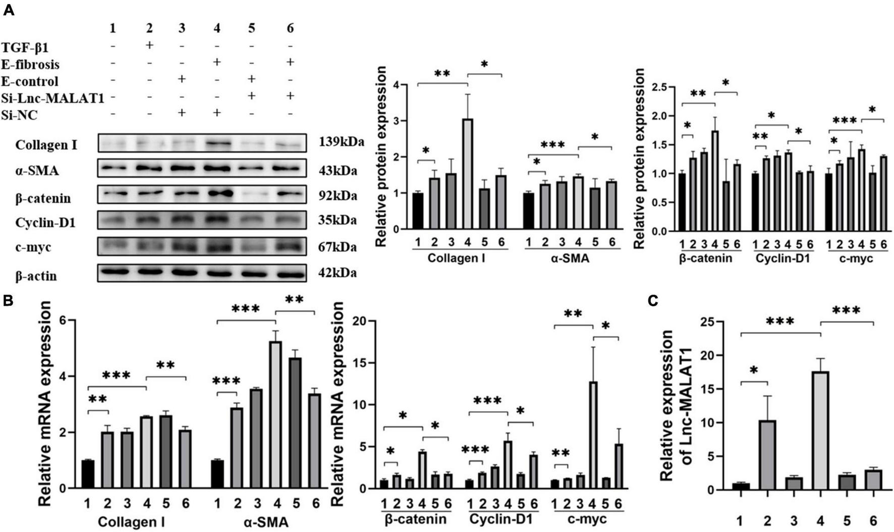 Inhibition of TGF-β1-induced fibrogenesis and β-catenin signaling in LX-2 cells by Lnc-MALAT1 knock-down. LX-2 cells were transfected with Lnc-MALAT1-specific siRNA or irrelevant small RNA, then treated with PBS or 10ng/ml TGF-β1 and continued to culture for another 44 h. (A) Western blot analysis of collagen I, α-SMA, β-Catenin, Cyclin-D1, and c-myc. The numbers indicate different treatment. Relative intensity of the bands was expressed in the middle and right panels (n = 6). (B) qRT-PCR analysis of the mRNA expression of collagen I, α-SMA, β-Catenin, Cyclin-D1 and c-myc (n = 6). (C) qRT-PCR analysis of the expression of Lnc-MALAT1 (n = 6). *, **, and *** represent p-values less than 0.05, 0.01 and 0.001, respectively.