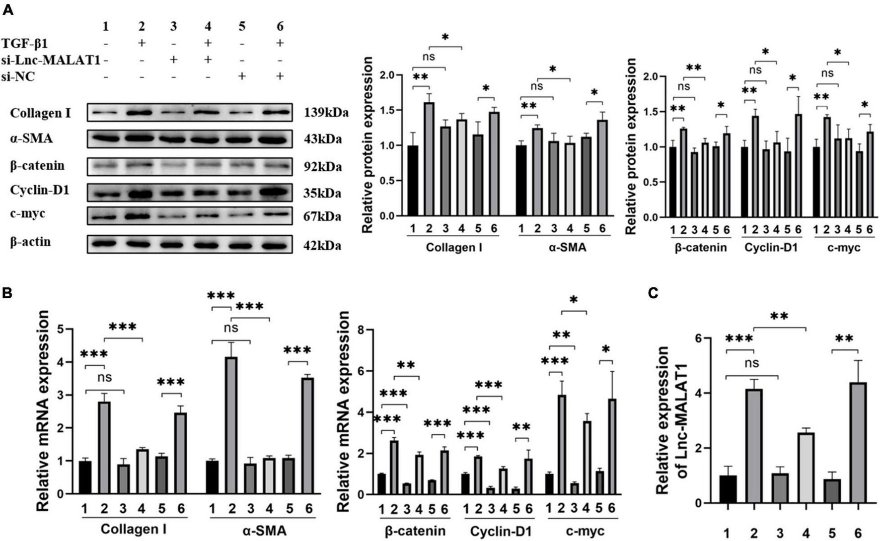 The results describe above indicated that TGF-β1 induced the activation and fibrogenesis and unexpectedly, up-regulation of Lnc-MALAT1 expression in LX-2 cells. For further understanding whether the TGF-β1-induced activation and fibrogenesis depend on increased Lnc-MALAT1 expressions, we first transfected the si-RNA specific for Lnc-MALAT1 (si-Lnc-MALAT1) into LX-2 cells and then observed the fibrogenic effects of treatment with TGF-β1. Similar to the results of Supplementary Figure 3, TGF-β1 treatment enhanced the mRNA and protein expressions of α-SMA, collagen I, cyclin-D1 and c-myc into LX-2 cells (Figures 4A,B). Pre-transfection of si-Lnc-MALAT1, but not irrelevant RNA (si-NC), suppressed the TGF-β1-induced fibrogenic effects (Figures 4A,B). Consistent with these results were the expression levels of Lnc-MALAT1 as detected by qRT-PCR (Figure 4C). These observations indicate that TGF-β1-induced activation and fibrogenesis of LX-2 cells are via up-regulation of endogenous Lnc-MALAT1 expression.
