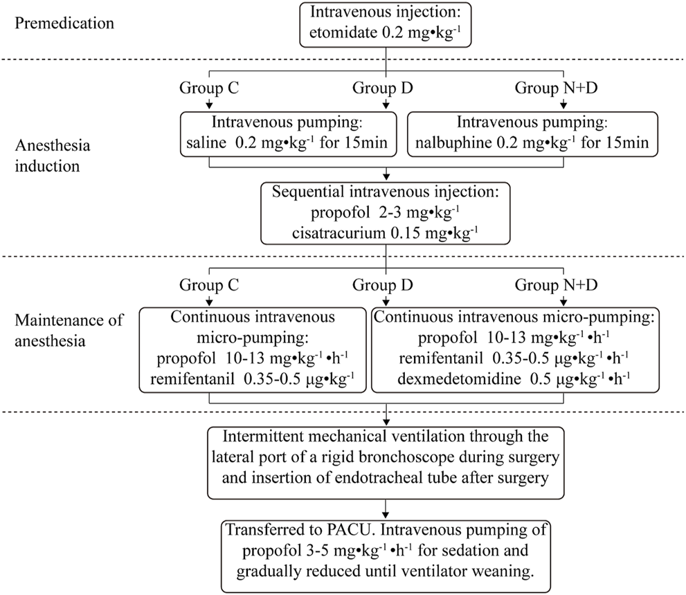 Detailed anesthesia method for the removal of the foreign body under rigid bronchoscopy. All patients sequentially underwent the procedures of premedication, anesthesia induction, maintenance of anesthesia, and anesthesia recovery. During the premedication procedure, nalbuphine was administered in group N + D; an equal amount of normal saline was administered in group D and group C. During anesthesia maintenance, group N + D and group D received dexmedetomidine until the end of the operation and group C received an equal amount of normal saline for maintenance.
