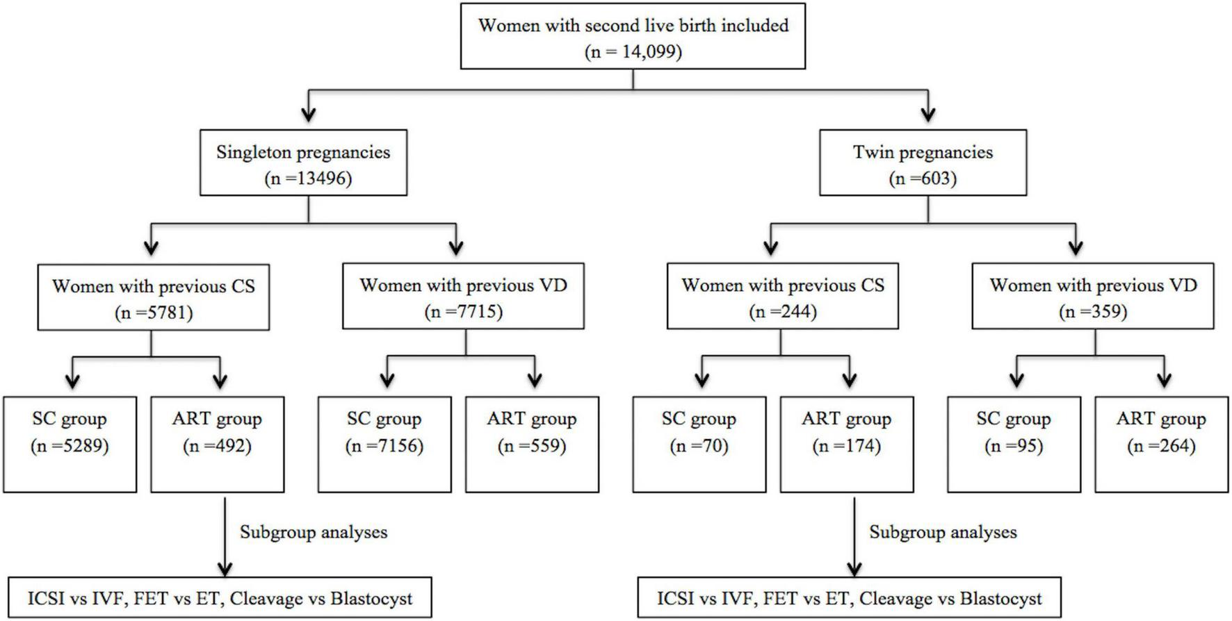 Flow chart of the population in a study of obstetric and perinatal outcomes in women with a single previous full-term delivery. ART, assisted reproductive technology; SC, spontaneously conceived; CS, Cesarean section; VD, vaginal delivery; IVF, in vitro fertilization; ICSI, intracytoplasmic sperm injection; ET, embryo transfer; FET, frozen-thawed ET.