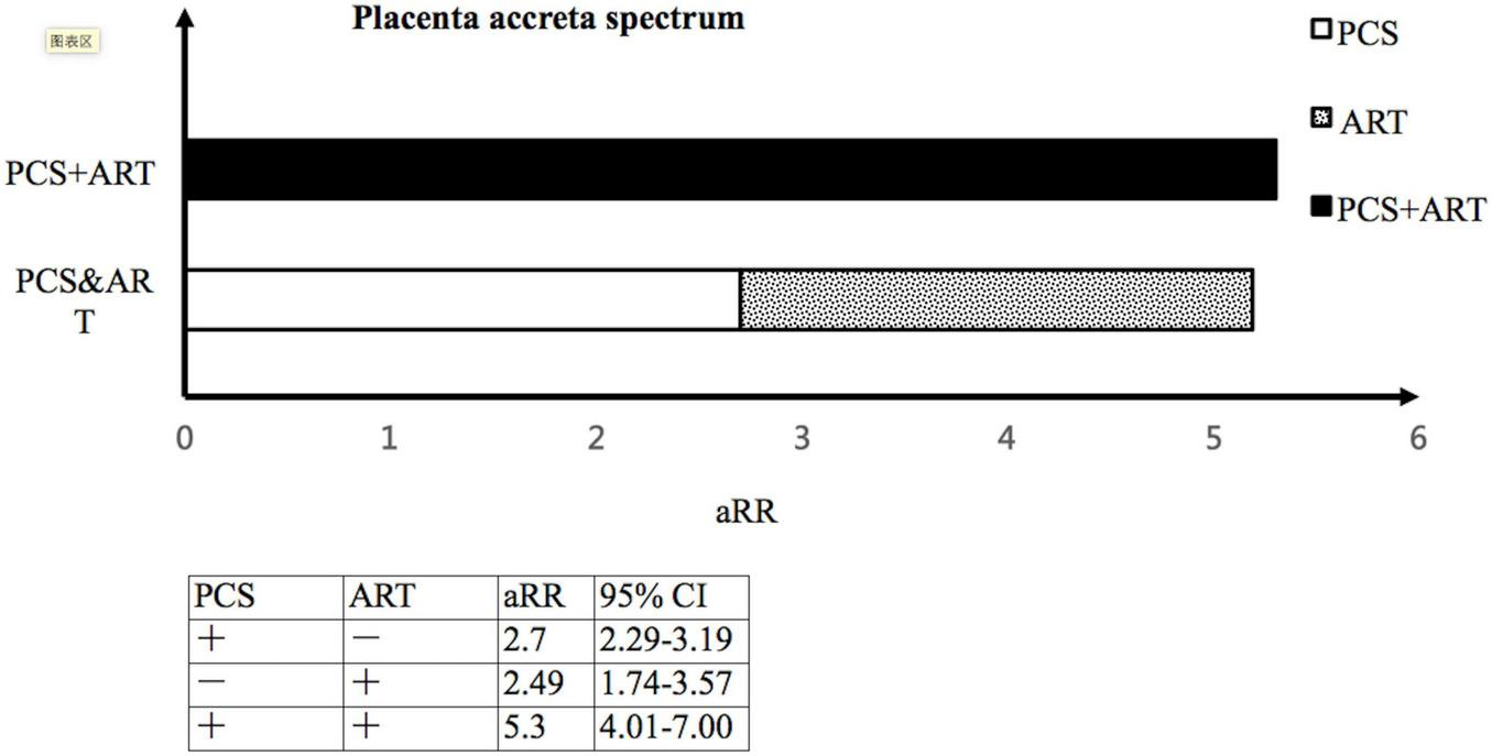 Women with singletons in CS–ART group were associated with an increased risk of maternal complications, such as gestational hypertension, GDM, velamentous placenta, placenta accreta spectrum, postpartum hemorrhage, as well as PTB, as compared with those with singletons in CS–SC group. This finding was in line with several recent cohort studies, and a 2016 meta–analysis including 50 cohort studies that showed high relative risks for adverse obstetric and perinatal outcomes in the ART group as compared with the spontaneous conception group (Qin et al., 2016; Zhu et al., 2016; Vannuccini et al., 2018; Yanaihara et al., 2018). Notably, the incidence of placenta accreta spectrum of singletons conceived through ART in our study (17.3%) was higher than that reported in a large-sample retrospective cohort study (6.9%) (Zhu et al., 2016). One of the possible explanations for this inconsistent result may be that our study was restricted to a high-risk population of women with previous CS, in contrast to previous studies. In the present study, women with singletons in the CS-ART group were 5.30 (95%CI 4.01–7.00) times more likely to develop placenta accreta spectrum than those with singletons in VD–SC group, which resulted from the positive interaction on the additive scale between the implementation of ART and previous CS. Although previous studies have identified previous CS as a risk factor for placenta accreta spectrum (Fitzpatrick et al., 2012), our study provided additional evidence suggesting that the implementation of ART and previous CS interacted synergistically to increase the likelihood of placenta accreta spectrum. This means that the joint effect of ART and previous CS exceeded the mere sum of their individual effects on placenta accreta spectrum.