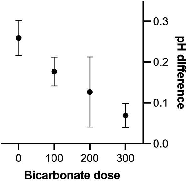 pH effect of different doses of bicarbonate administered intravenosly during maximal ergometer rowing in seven oarsmen. X-axis is the dose group of bicarbonate used (100: use of 100 mmol in two subjects, 200 use of 200–240 mmol in four subjects and 300 administration of 300–340 mmol in four subjects) while “0” represent the control saline trial in six subjects. Y-axis is the difference between the pH at rest in samples obtained in the sixth minute of rowing. It is a limitation not all subjects received same amount of bicarbonate.