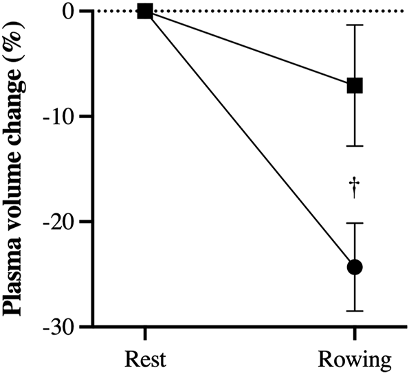 Estimated rowing induced decrease in plasma volume (%) in trials with administration of bicarbonate (square) compared to control (circle). †, difference between rowing with bicarbonate and control; p < 0.05.