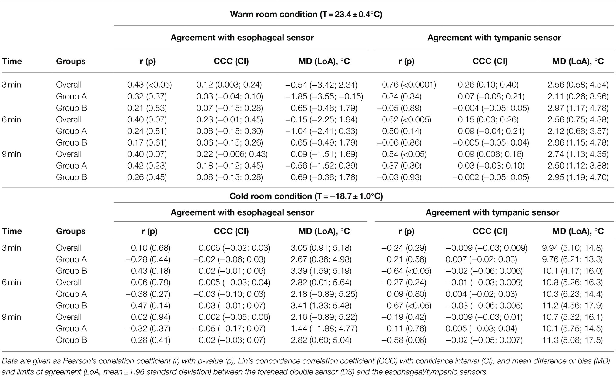 Figure 4. Agreement between temperature values measured by the forehead double sensor (TDS) and the esophageal sensor (TES) after 9 min in the warm (left) and cold room (right) settings. Bland–Altman plots and correlation plots are displayed in the upper and lower panels, respectively, and subjects are color-coded according to the randomization groups (group A, blue; group B, green). In the Bland–Altman plots, the solid line indicates the mean difference and the dashed lines the limits of agreement (mean ± 1.96 standard deviation) for the overall population. In the correlation plots, the linear regression line (dashed line), Pearson’s correlation coefficient (r) with value of p (p), and Lin’s concordance correlation coefficient (CCC) and confidence interval, are indicated for the overall population.