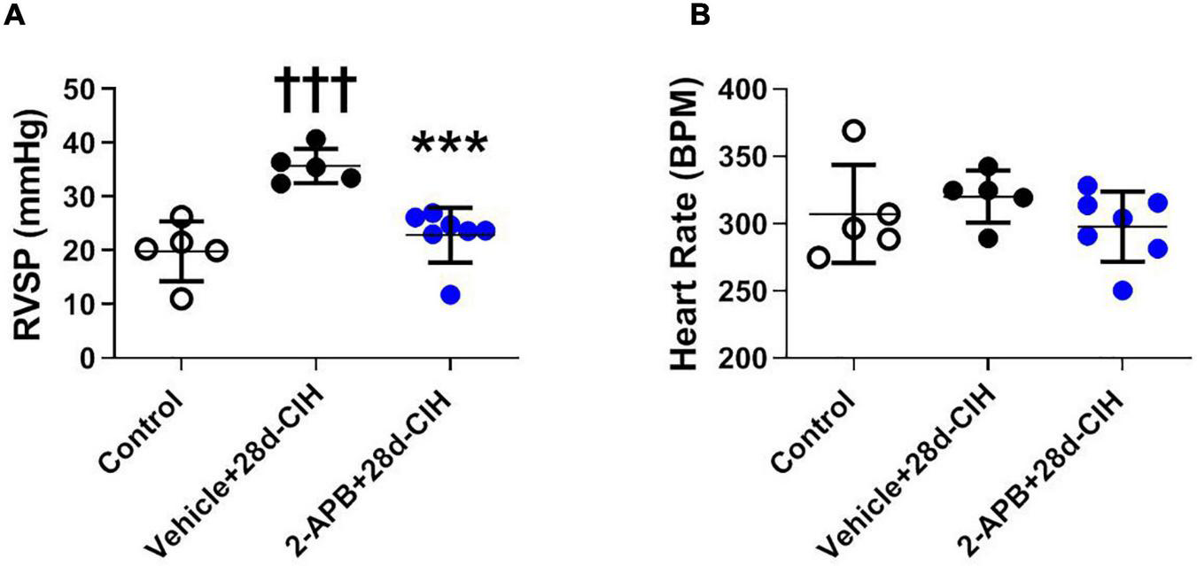 Effect of 2-APB on right ventricular systolic pressure and heart rate in rats exposed to chronic intermittent hypoxia. 2-APB was infused from 14 days of CIH exposure with osmotic pumps at a rate of 10 mg/kg/day. (A) Right ventricular systolic pressure (RVSP) (ANOVA P = 0.0002). (B) Heart rate (HR) (ANOVA P = 0.41) in control (empty circles, n = 5), Vehicle + 28d-CIH (black circles, n = 5), and 2-APB + 28d-CIH rats (blue circles, n = 7). Mean ± SD. †††P < 0.001 vs. all groups, ***P < 0.001 vs. Vehicle + 28d-CIH. One way ANOVA-followed by Newman Keuls tests.
