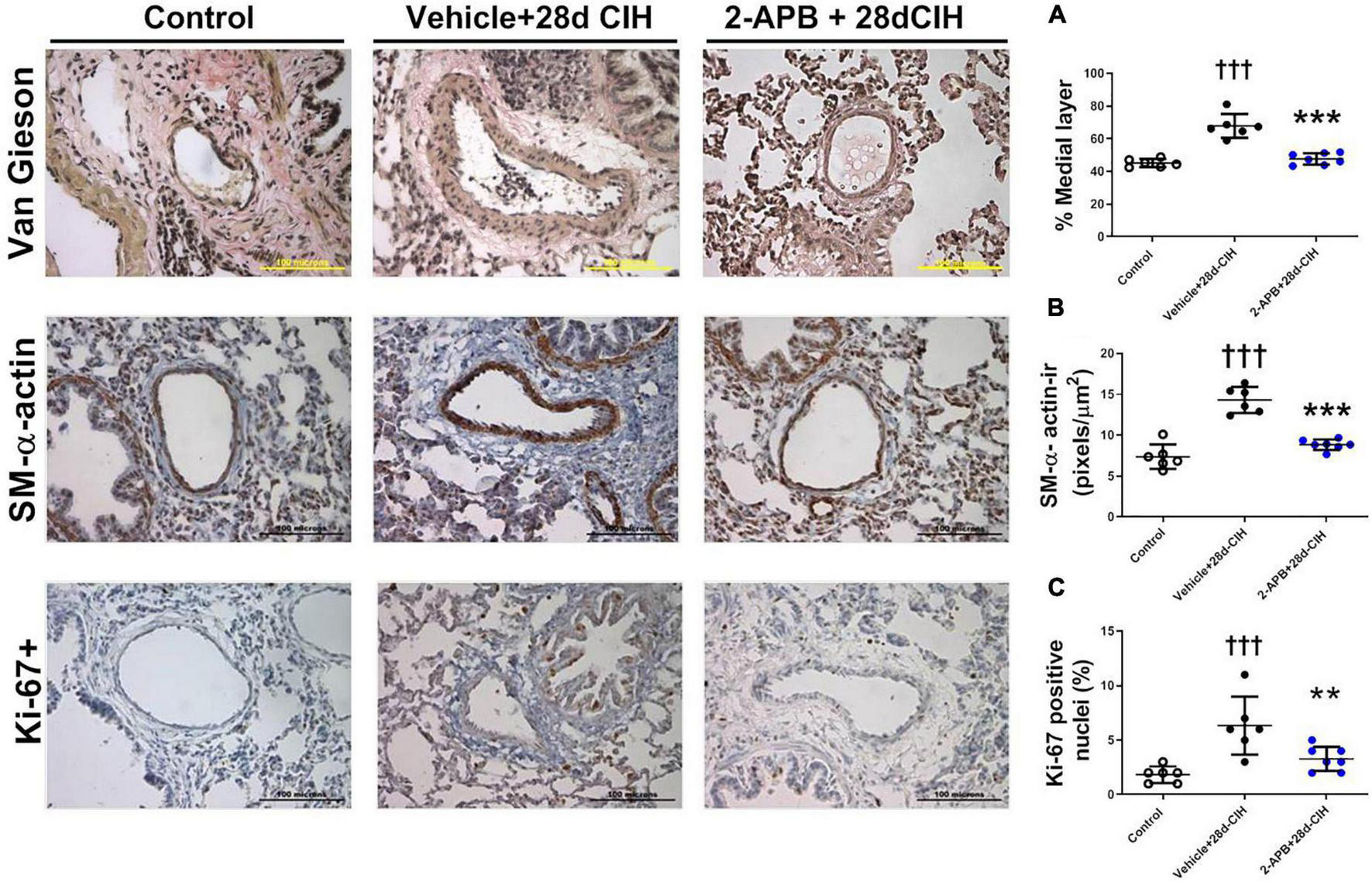 Effect of 2-APB on pulmonary vascular remodeling induced by chronic intermittent hypoxia. (A) Medial layer (ANOVA P < 0.0001). (B) α-actin immunoreactivity in the medial layer (ANOVA P < 0.0001). (C) Ki-67 positive cells in PASMC (ANOVA P = 0.0009) of control (empty circles, n = 6), Vehicle + 28d-CIH (black circles, n = 6), and 2-APB + 28d-CIH rats (blue circles, n = 7). The % of medial layer was measured as (muscle area - lumen area)/(muscle area * 100). Scale bar = 100 μm. †††P < 0.001 vs. all groups, **P < 0.01 vs. Vehicle + 28d-CIH ***P < 0.001 vs. Vehicle + 28d-CIH, One way ANOVA-followed by Newman Keuls test.