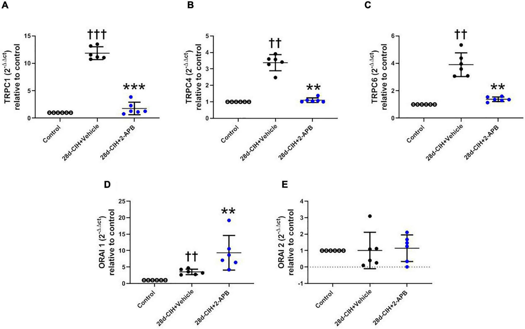Effect of 2-APB on the relative gene expression of STOC following chronic intermittent hypoxia. (A) relative lung gene expression of TRPC1 (ANOVA, P = 0.0001). (B) TRPC4 (ANOVA, P = 0.0017). (C) TRPC6 (ANOVA, P = 0.0003). (D) ORAI1 (ANOVA, P = 0.0005), and (E) ORAI2 (ANOVA, P = 0.9612) in control (empty circles, n = 6), Vehicle + 28d-CIH (black circles, n = 6), and 2-APB + 28d-CIH rats (blue circles, n = 6). Values expressed as 2–ΔΔCT related to the control. Mean ± SD. ††P < 0.01 vs. all groups, †††P < 0.001 vs. all groups **P < 0.01 vs. Vehicle + 28d-CIH, ***P < 0.001 vs. Vehicle + 28d-CIH, One way ANOVA-followed by Newman Keuls tests.