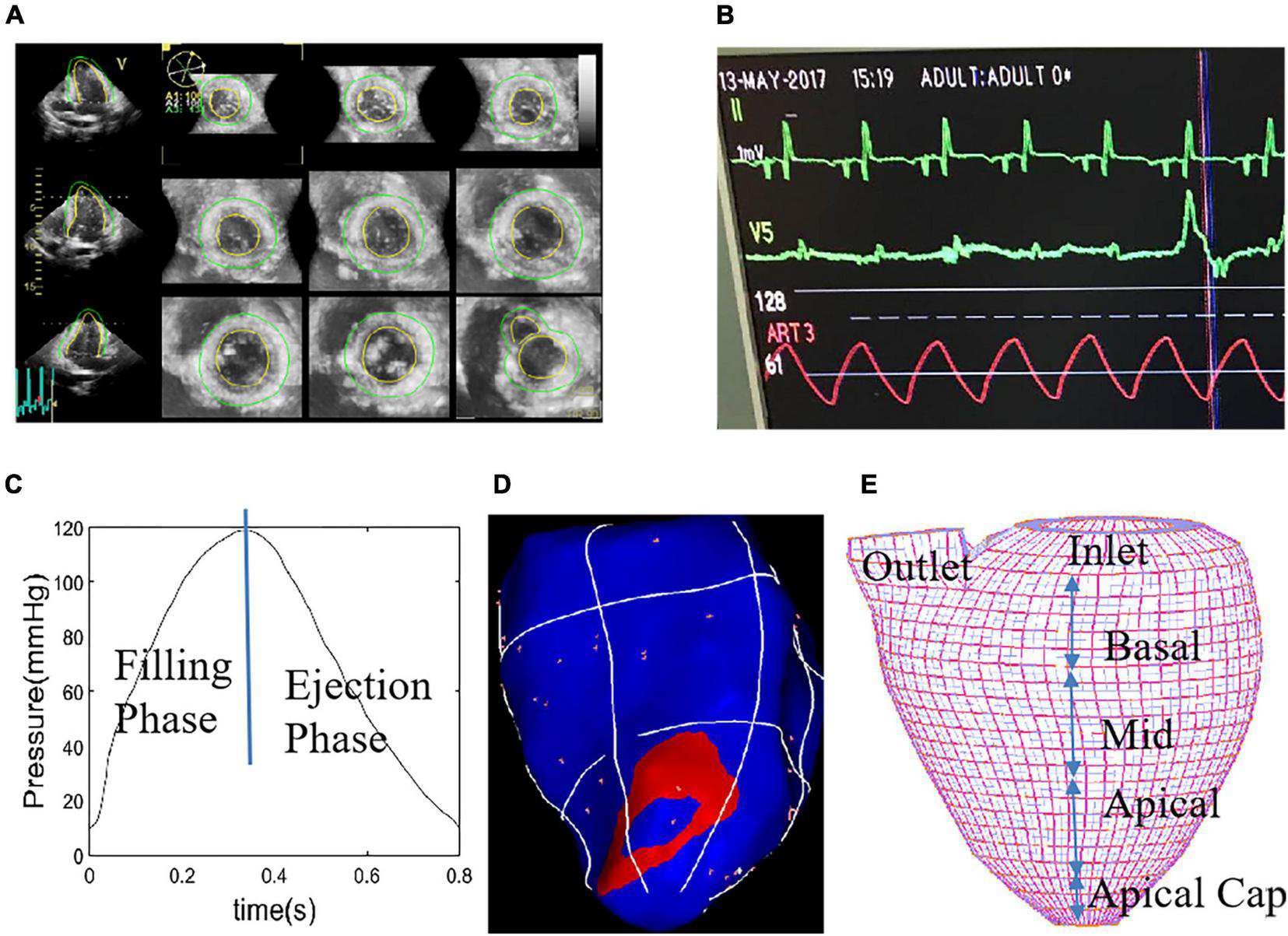 Echo image of right ventricular apex (RVA) pacemaker, pressure profile, electric signal mapping and re-constructed left ventricular (LV) geometry with mesh. (A) End-Systolic Echo image, RVA. (B) Recorded LV blood pressure profile. (C) Imposed LV blood pressure profile. (D) Electric signal mapping, RVA model. (E) Re-constructed LV geometry with mesh which was used to divide LV into small regions to specify tissue stiffness variations corresponding to electric signal propagation.