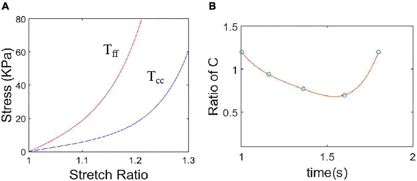 Material stress-stretch curves for a baseline model with right ventricular apex (RVA) pacemaker. (A) Baseline material stress-stretch curves, Tff: stress in fiber direction, Tcc: stress in circumferential direction of the fiber. (B) Stiffness variation in a cardiac cycle for a sample region of the model with RVA pacemaker. Stiffness variation was realized by adjust C values in Eq. (12).