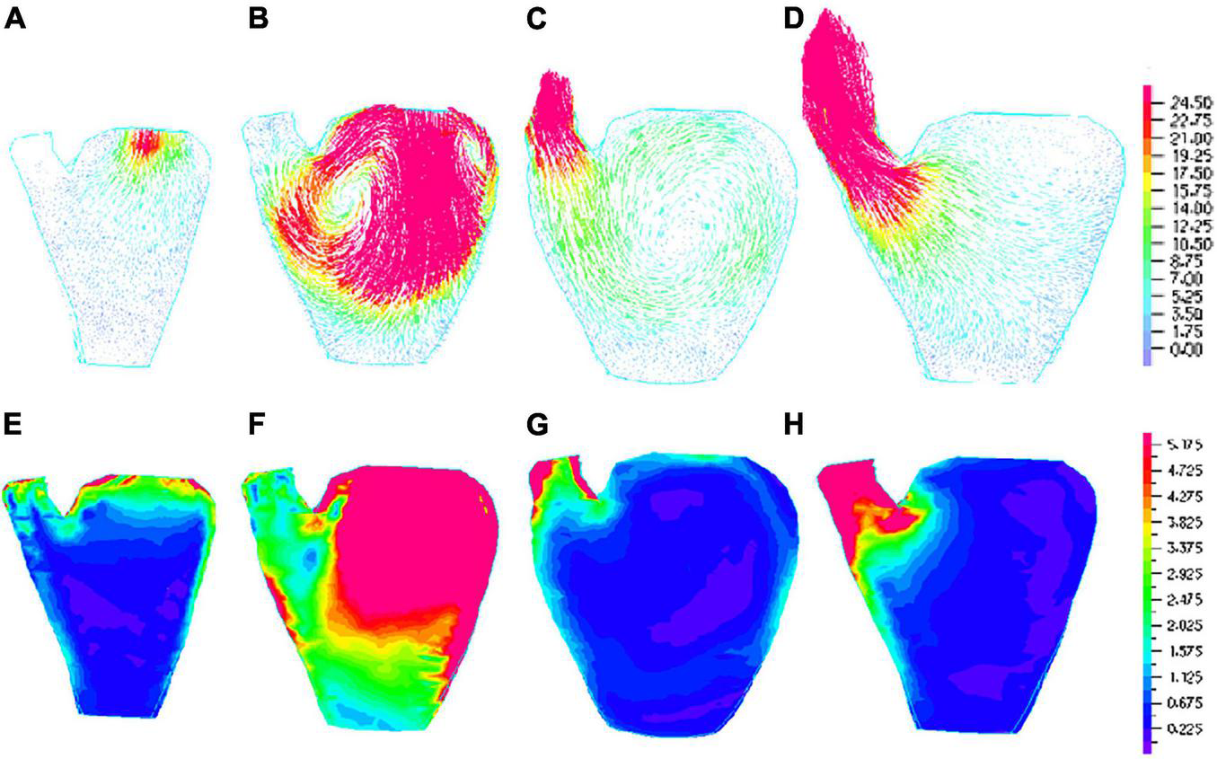 The Echo-based anisotropic LV models were constructed for the four different pacing locations and the models were solved by ADINA (ADINA R&D, Watertown, MA, United States) using unstructured finite elements and the Newton-Raphson iteration method. The “Re-Start” feature in ADINA was used to adjust material parameters at each numerical time step to implement the potential conduction of myocardium. Flow velocity, flow shear stress (FSS) and stress/strain distributions were obtained for analysis. Because stress and strain are tensors, for simplicity, maximum principal stress (Stress-P1) and strain (Strain-P1) were used and referred to as stress and strain in this paper.