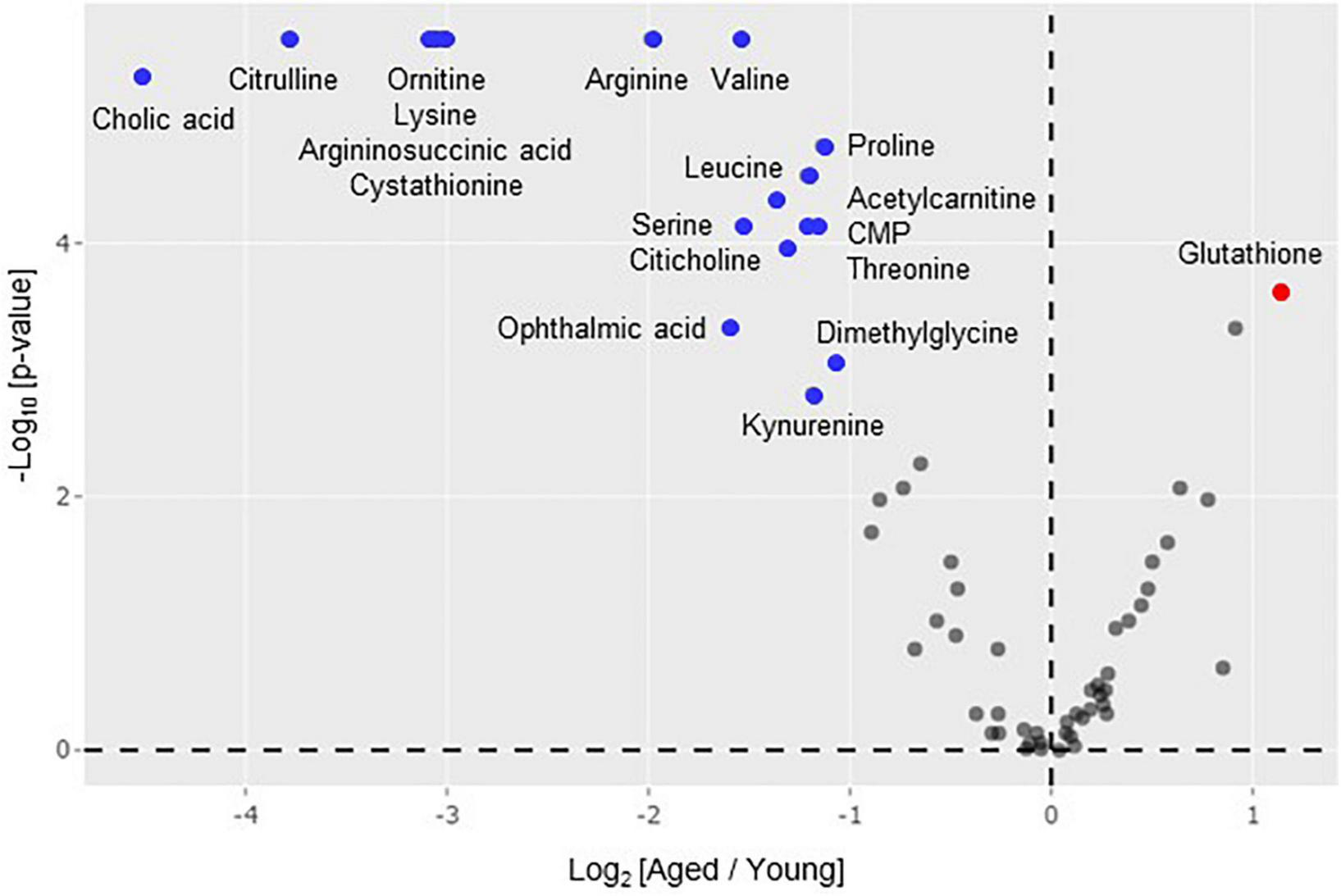 To elucidate the metabolite profiles of the mice, liver samples from both young and aged FR mice were subjected to metabolomic analysis. The 64 metabolites detected in the liver were displayed in a volcano plot, which shows the log2 fold-change value (x-axis) versus -log10p-value (y-axis) of metabolites in aged FR mice compared with young FR mice (Figure 2). The levels of 18 metabolites (blue dots) were decreased and the level of 1 metabolite (red dot) was increased with a minimum log2 fold change of ±1 and a statistical significance of p < 0.05. These metabolites were amino acids, including branched-chain amino acids (BCAAs), cystathionine, glutathione (GSH), and metabolites related to urea cycle, as well as carnitine, bile acid, choline, and kynurenine.