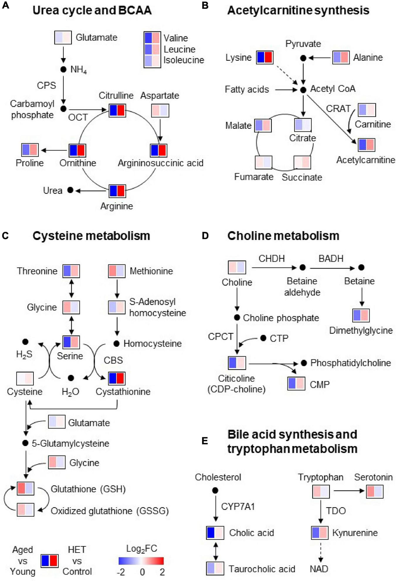 Pathway maps of the metabolic profile of mouse liver under conditions of food restriction. (A–E) Metabolic pathways involved in the liver metabolites significantly altered in aged mice. Heatmap showing the fold-change in the level of each metabolite in the liver of aged mice (n = 9) (compared with young mice; n = 14) and hochuekkito (HET)-treated aged mice (n = 10) (compared with control aged mice; n = 9). The red and blue regions indicate increases and decreases in the metabolite levels, respectively. BADH, betaine aldehyde dehydrogenase; CBS, cystathionine β-synthase; CHDH, choline dehydrogenase; CMP, cytidine monophosphate; CPCT, CTP:choline-phosphate cytidylyltransferase; CPS, carbamoyl phosphate synthetase-1; CRAT, carnitine acetyltransferase; CTP, cytidine triphosphate; CYP7A1, cholesterol 7α-hydroxylase; NAD, nicotinamide adenine dinucleotide; OCT, ornithine carbamoyltransferase; TDO, tryptophan 2,3-dioxygenase.