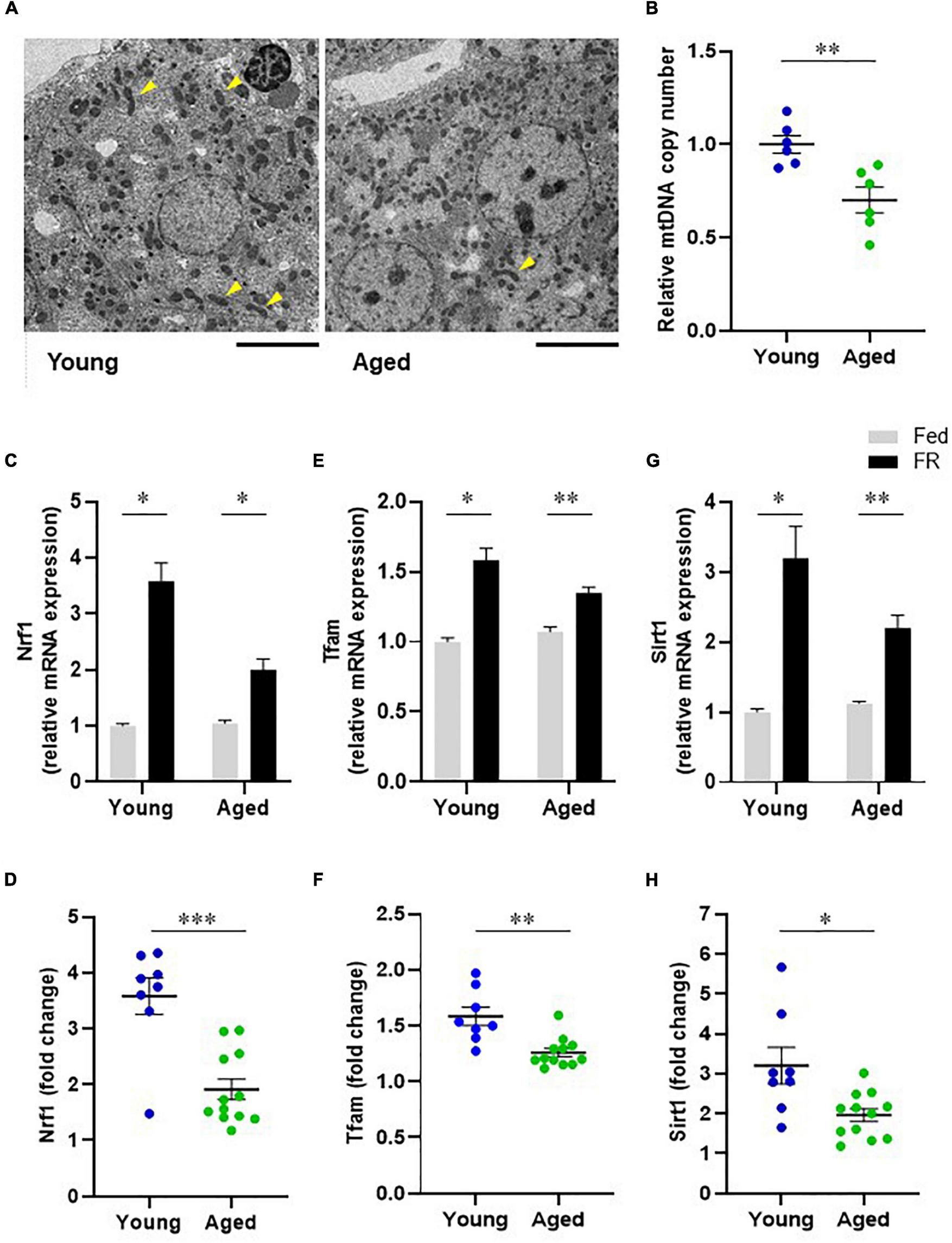 Hepatic mitochondrial biogenesis in young and aged mice. (A) Transmission electron microscope images of mitochondria in hepatocytes (Scale bar = 10 μm). Arrowheads show elongated mitochondria. (B) Comparison of hepatic mitochondrial DNA (mtDNA) copy numbers corresponding to young and aged mice (n = 6 in each group). (C–F) mRNA expression levels of mitochondrial biogenesis regulators, nuclear respiratory factor 1 [Nrf1, (C)] and mitochondrial transcription factor A [Tfam, (E)] in mice with food restriction (FR) compared with mice fed ad libitum (Fed). Panels (D,F) indicate fold changes in response to FR. (G) Sirtuin1 (SIRT1) mRNA expression in both fed and FR mice. (H) Change in SIRT1 expression level in response to FR. Young Fed, n = 6; aged Fed, n = 5; young FR, n = 8; and aged FR, n = 12. Data are presented as mean ± standard error (SE). *p < 0.05, **p < 0.01, ***p < 0.001; Steel–Dwass tests, multiple-group comparisons; Aspin–Welch t-test, two-group comparisons.