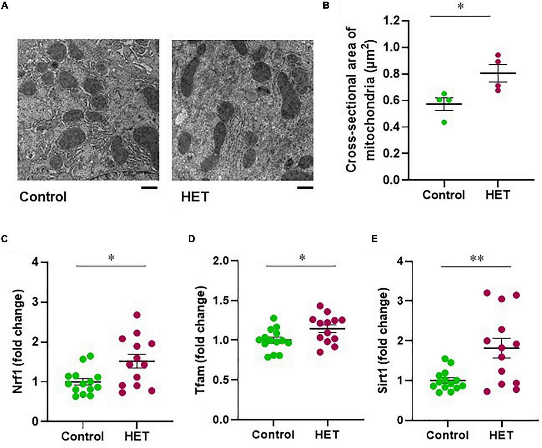 Next, we evaluated the effects of HET on mitochondrial morphology and biogenesis regulators in aged mice. The mean cross-sectional area of mitochondria in hepatocytes from the livers of HET-treated aged mice was larger than that corresponding to the aged control mice (Figures 6A,B). Further, the mRNA expression levels of NRF1 and TFAM after FR were significantly higher in the HET-treated group than in the control group (Figures 6C,D). Additionally, increased SIRT1 mRNA expression was observed in the HET group (Figure 6E). These results, combined with the findings described above, indicated that HET can restore hepatic mitochondrial biogenesis by inducing SIRT1 expression in aged mice.