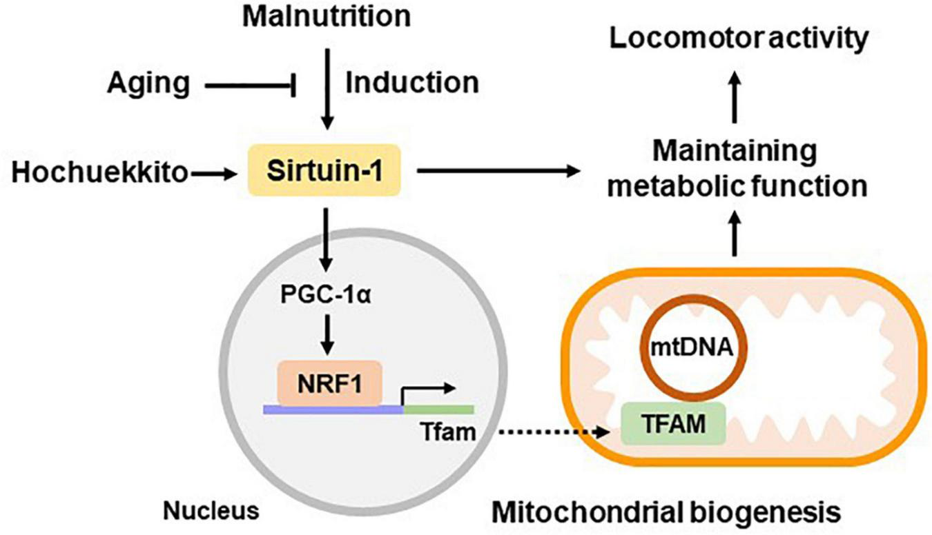 Hypothetical scheme of liver metabolic function during aging. Hepatic sirtuin1 (SIRT1) expression was induced by malnutrition and regulated metabolic functions by partially promoting the expression of mitochondrial biogenesis regulators, peroxisome proliferator-activated receptor co-activator 1 alpha (PGC-1α), nuclear respiratory factor 1 (NRF1), and mitochondrial transcription factor A (TFAM). These signaling pathways showed decline during the aging process, resulting in decreased energy production. Hochuekkito showed efficacy in ameliorating hepatic metabolic function and locomotor activity, which is mediated via SIRT1 upregulation. Data related to PGC-1α were based on our previous study using the same model as that in this study (Nahata et al., 2021).