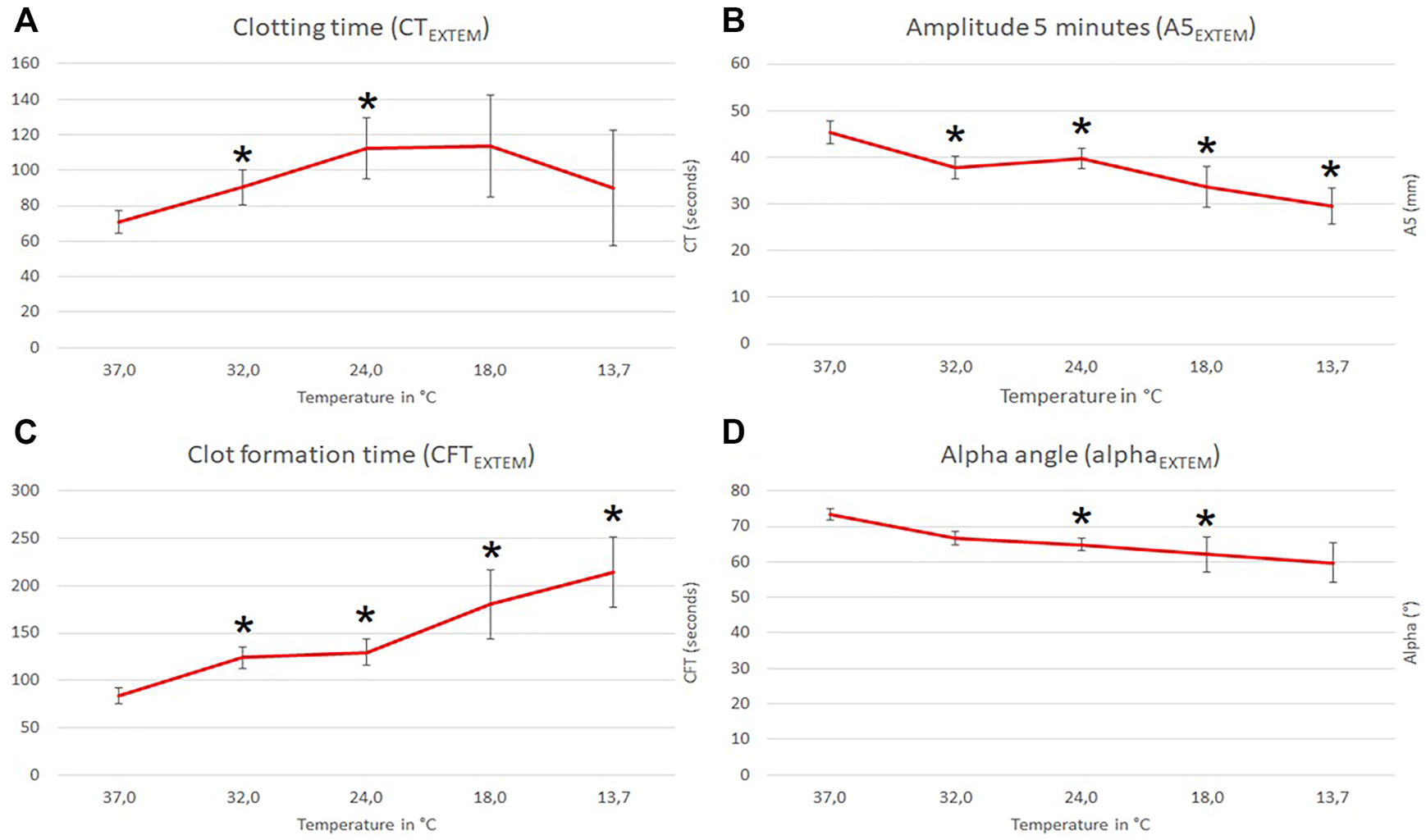 Influence of temperature (x-axis, temperature in degrees Celsius) on ROTEM EXTEM standard parameters (y-axis, seconds in (A) and (C); mm in (B) and degrees in (D); mean values with respective 95% confidence interval (CI) are shown). * indicates significant differences to baseline at 37°C (p-values <0.05).