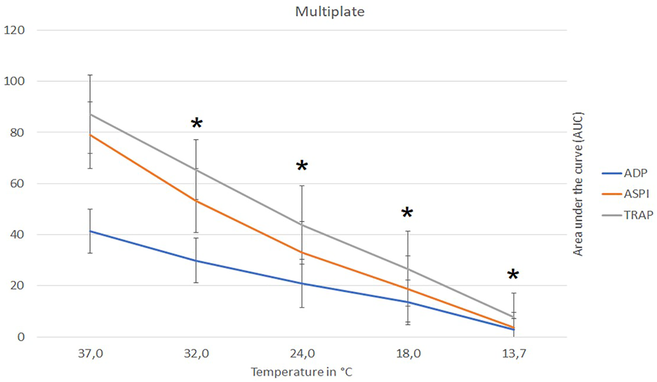Hirudin whole blood samples were incubated for a minimum of 30 min at the respective target temperature. Afterwards, blood samples were analyzed using a Multiplate® Analyzer (Roche Diagnostics, Basel, Switzerland) and initiated using arachidonic acid 0.5 mM (ASPI test), thrombin receptor-activating peptide-6 32 µM (TRAP test) or adenosine diphosphate 6.4 µM (ADP test) according to manufacturer’s instructions. The blood samples were analyzed at the set low temperatures. Given the small quantity of liquid, approx. 600 μL, we cannot rule out any rewarming during the analysis. All tests (ROTEM and Multiplate) were performed in an air-conditioned room to keep the ambient temperature low. For normal operation, the Multiplate analyzer uses a heating bar to warm the blood samples. We bypassed this warming-up phase and started the tests immediately in the cold analyzer. Additionally, we did not add 300 μL of the pre-warmed NaCl 0.9% but a NaCl 0.9%, which had the same temperature as the blood sample to be tested. Test results were expressed as the area under the curve (AUC). Device temperature was set to the respective experimental temperature range (13.7°C–37°C, see above).