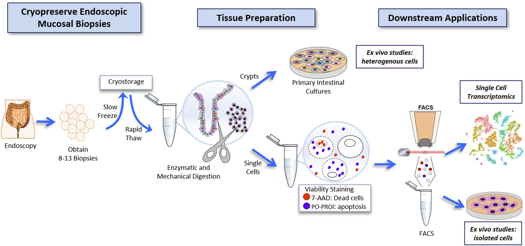 Workflow for the cryopreservation of endoscopically obtained human intestinal mucosal biopsies, and subsequent preparation of this tissue to highly viable FACS-isolated single-cell suspensions compatible with deep single-cell RNA sequencing, and primary intestinal culture.