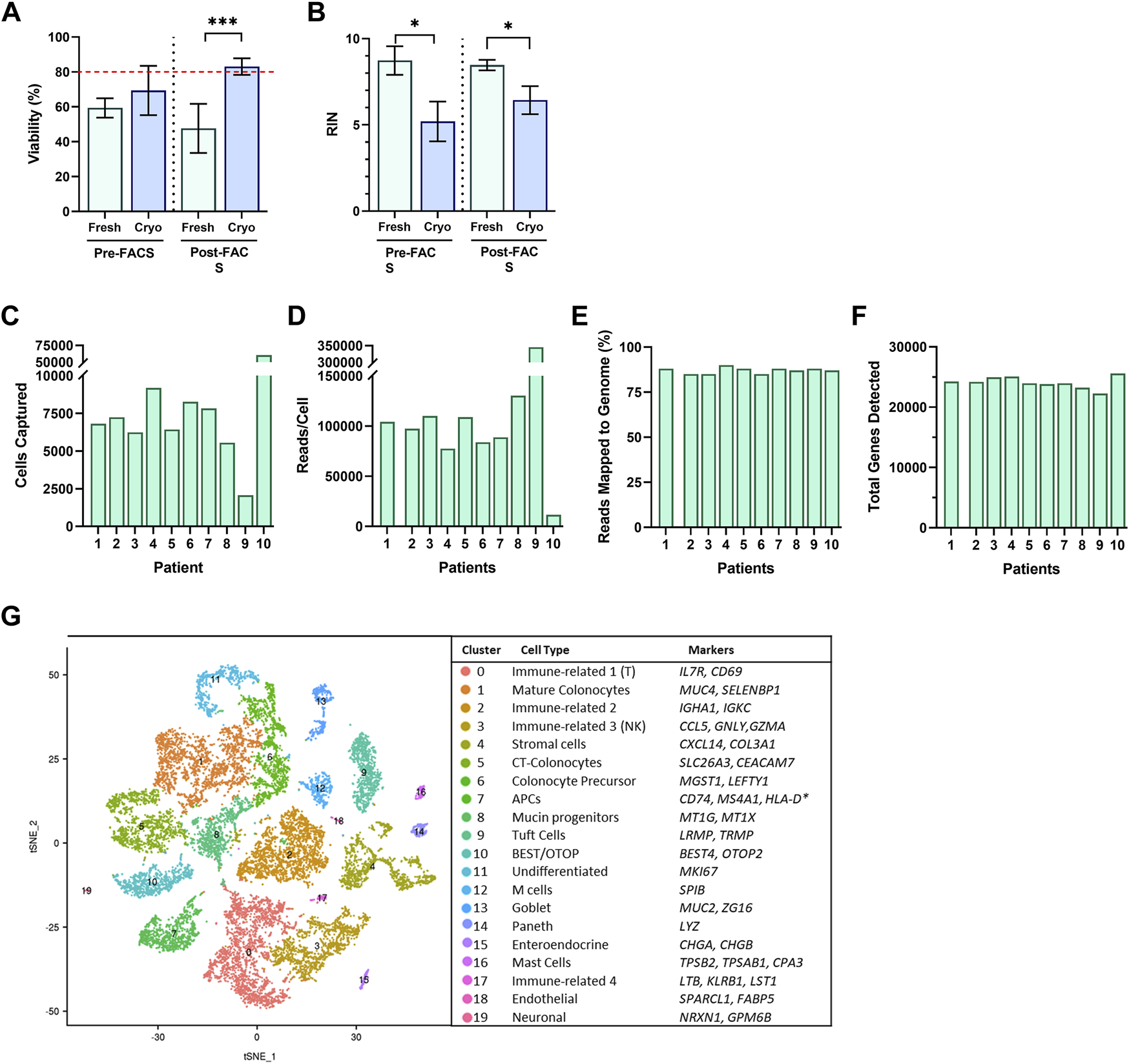 Single cells suspensions were assessed for (A) cell viability and (B) RNA Integrity Number (RIN) from fresh (green; n = 3, 2, for pre/post respectively) and cryopreserved (blue; n = 3, 10, for pre/post respectively) tissue preparations during Pre-FACS isolation and 1-h Post-FACS isolation. Summary of Data Generation from scRNA-Sequencing of FACS-isolated Human Colonic Epithelial Cells Originating from Cryopreserved Biopsies of 10 participants for (C) cell captured, (D) reads/cell, (E) reads mapped to genome (%), and (F) total genes detected. (G) Single-Cell RNA-Seq Profiling of Human Colonic Epithelium. t-SNE plots of single-cell RNA-seq profiles of human intestinal epithelial cells, colored by cluster number and identity, listed by largest to smallest population, and annotated by cluster identity, determined by gene markers for subtypes. Significance testing used a two-tailed student t-test; *p < 0.05, ***p < 0.001.
