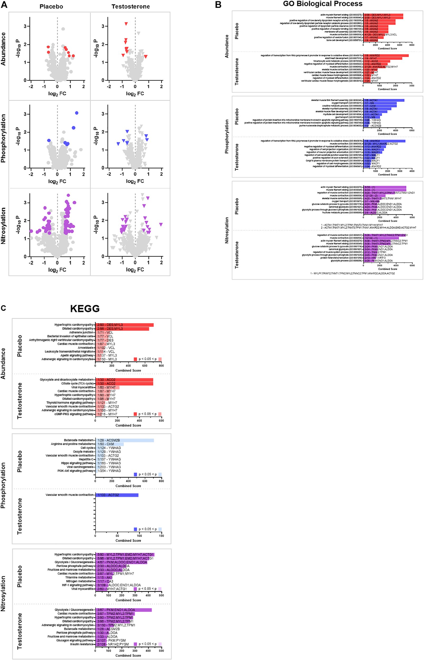 To identify potential biological processes and molecular pathways that were altered within each group, the sets of significantly altered protein IDs from each grouping were subjected to gene set enrichment analysis (GSEA) based on the 2021 Gene Ontology (GO) and Kyoto Encyclopedia of Genes and Genomes (KEGG) databases using the online Enrichr platform (https://amp.pharm.mssm.edu/Enrichr/) (Chen et al., 2013; Kuleshov et al., 2016; Xie et al., 2021). Significantly altered biological pathways were identified by an adjusted p < 0.05 using the Fisher exact test, and Benjamini–Hochberg method for correction for multiple hypotheses testing. Data were visualized based on an Enrichr combined score calculated by multiplying the log of the p-value from the Fisher exact test by the z-score of the deviation from the expected rank. Separate analyses were performed to identify altered pathways based on significantly altered protein abundance, S-nitrosylation, and phosphorylation. The processes and pathways identified through Enricher were interpreted in context of the phenotypical changes observed in the placebo vs. testosterone treated groups as previously reported (Wright et al., 2018).