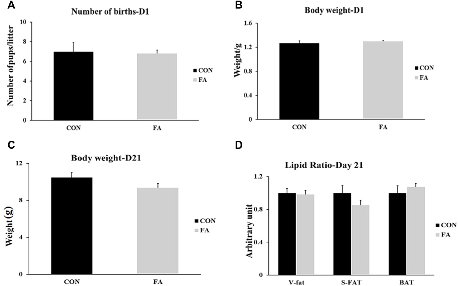 Effect of maternal intake of EPA/DHA enriched diet on number of births and body weight of new born pups at D1 and D21. The mothers were assigned to two groups, one received control diet (CON) and the other was fed EPA/DHA enriched diet (FA). (A) Statistical analysis of number of births (B) Body weight difference between tested groups at D1. (C) Body weight difference between tested groups measured in gram at D21. (D) Fat ratio corrected by body weight. Body weight was measured in gram. Data was analyzed by Student’s t-test (n = 20) and represent as mean ± SEM. Non-significant difference was observed between groups. Fat ratio was calculated by dividing the weight of a certain fat deposits (BAT, visceral fat, and subcutaneous fat) on total body weight and the results was normalized by body weight.