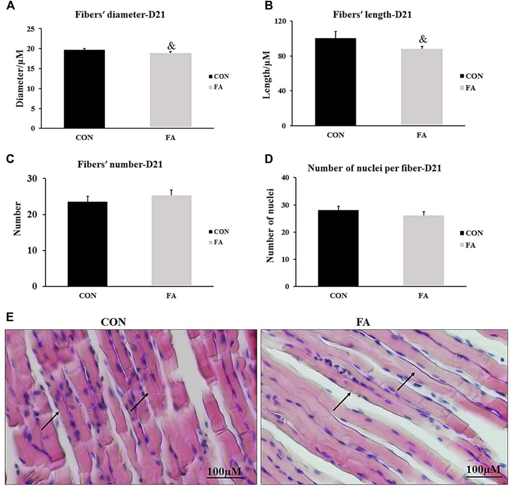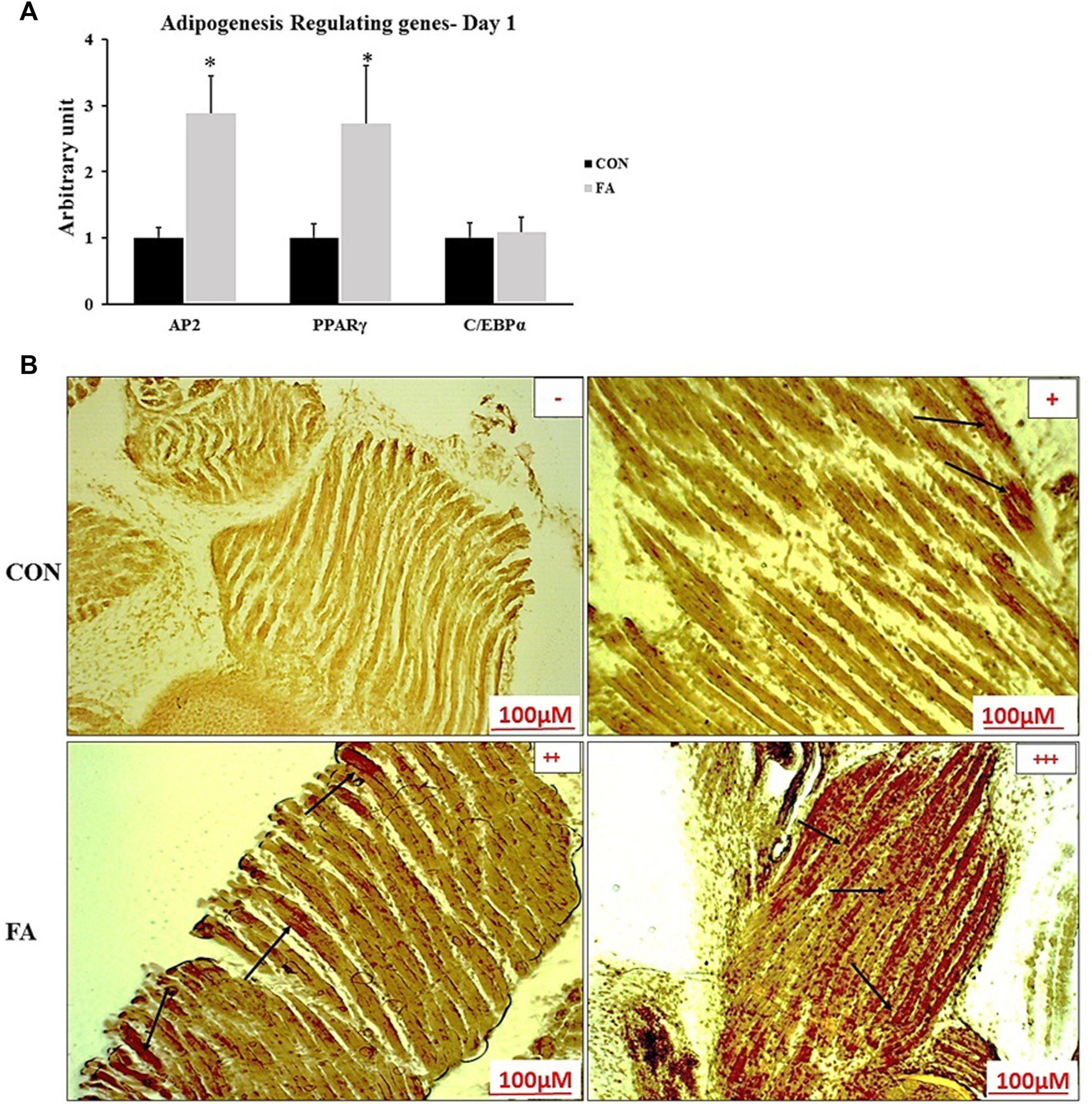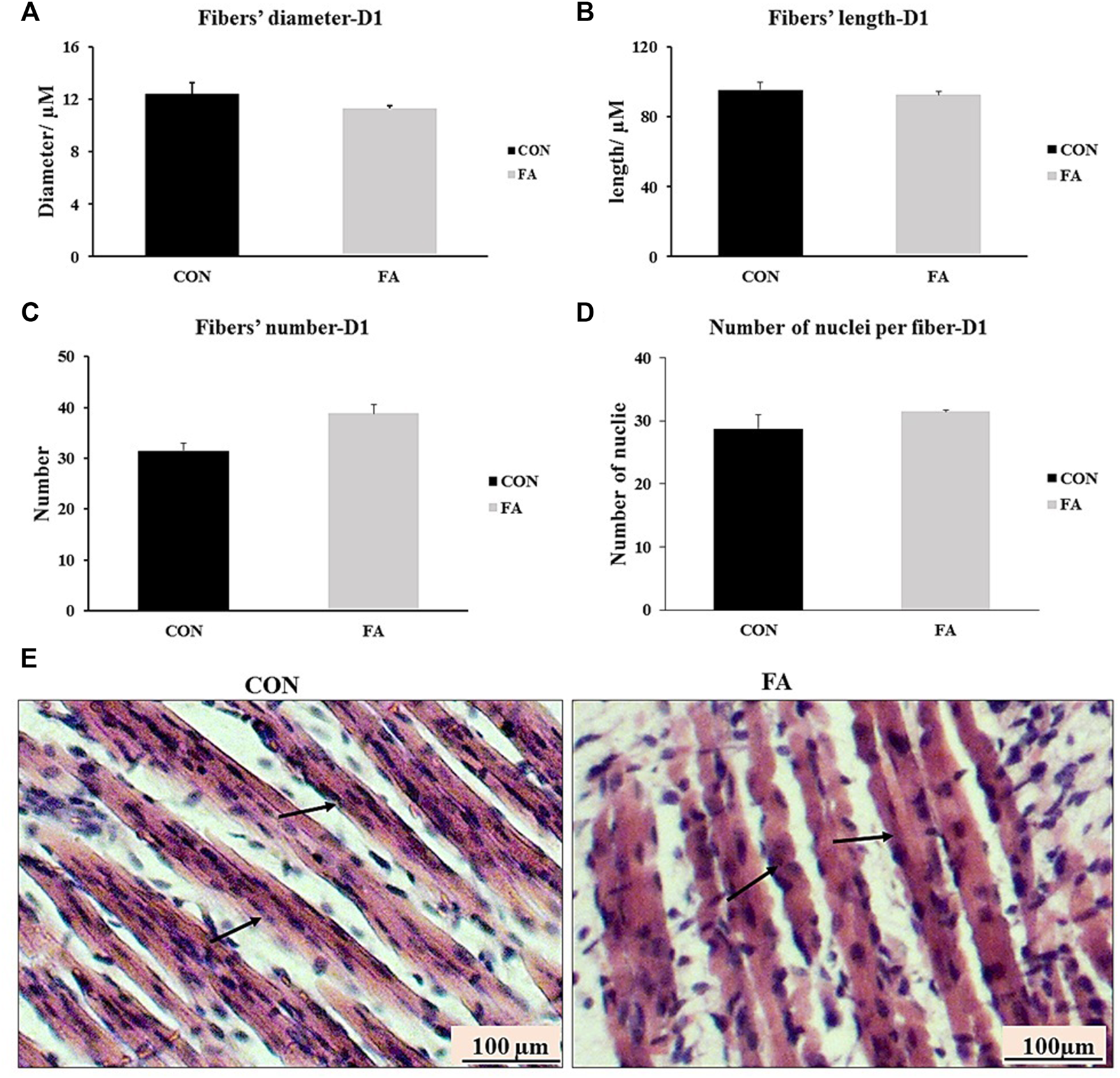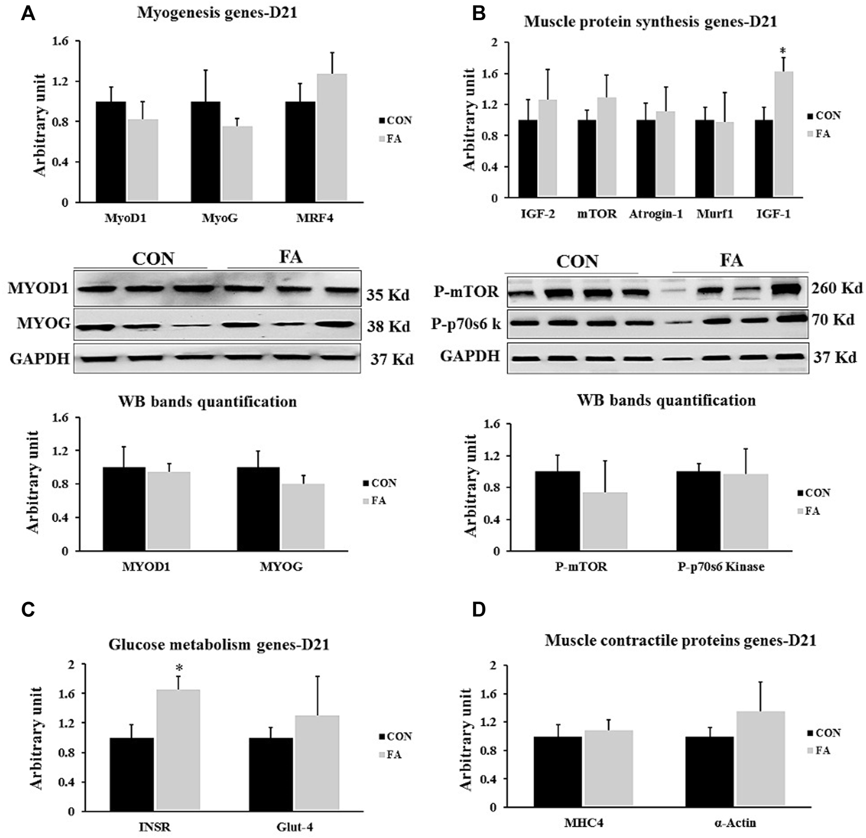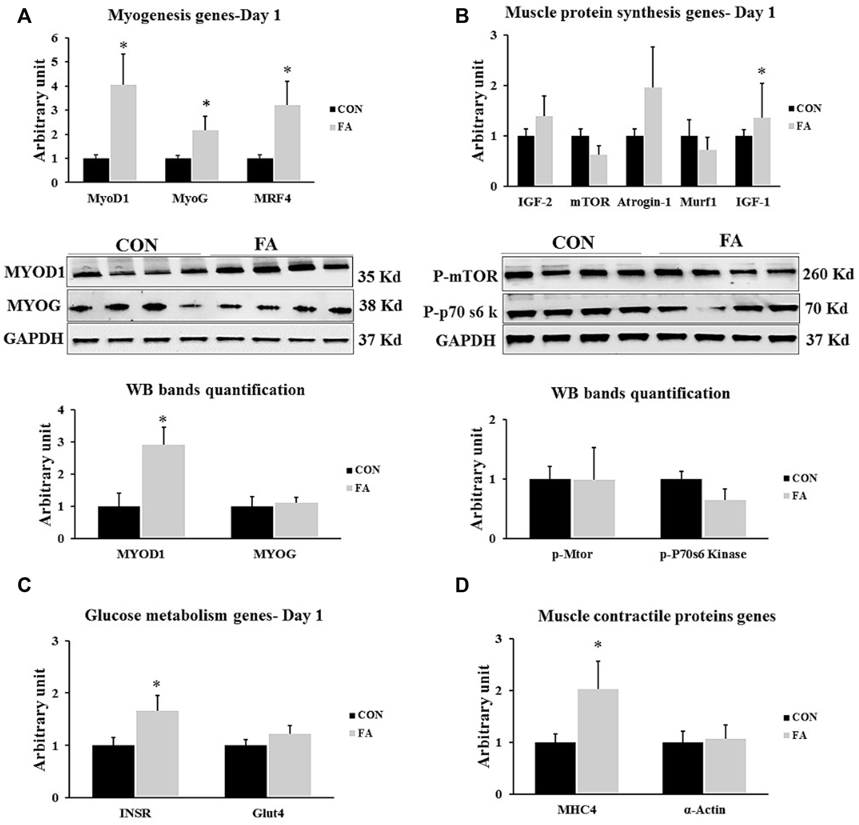 The results exhibited non-significant differences between control and FA treated groups in expression levels of genes regulation myogenesis process including MyoD1, MyoG, and Myf5, myogenic regulatory factor (MRF4), and β-catenin (p = 0.083881, 0.09182, 0.49113, 0.312692, and 0.494429 respectively). Also, the transcripts of genes encoding the main muscle structural proteins including myosin heavy chain-4 (MHC4) and α-actin were comparable between control and FA treated groups (p = 0.448238 and 0.201322 respectively). Moreover, non-significant differences were observed in expression levels of genes regulating muscle protein synthesis and glucose metabolism, including mammalian target of rapamycin (mTOR), muscle ring finger 1 (MURF1), insulin-like growth factor 2 (IGF-2), F-box only protein 32 (Atrogin-1), insulin-like growth factor 1 (IGF-1), Insulin receptor (INSR), and glucose transporter-4 (p = 0.26, 0.25, 0.067, 0.13, 0.23, 0.399, and 0.29 respectively). Furthermore, no significant differences were observed in the expression levels of adipogenesis regulating genes including peroxisome proliferator-activated receptor gamma (PPARγ), CCAAT Enhancer Binding Protein Alpha (CEBPα), and Adipocyte fatty acid binding protein (AP2) between control and FA treated groups at this time point (p = 0.339223, 0.334623, and 0.48406 respectively) (Figure 2).