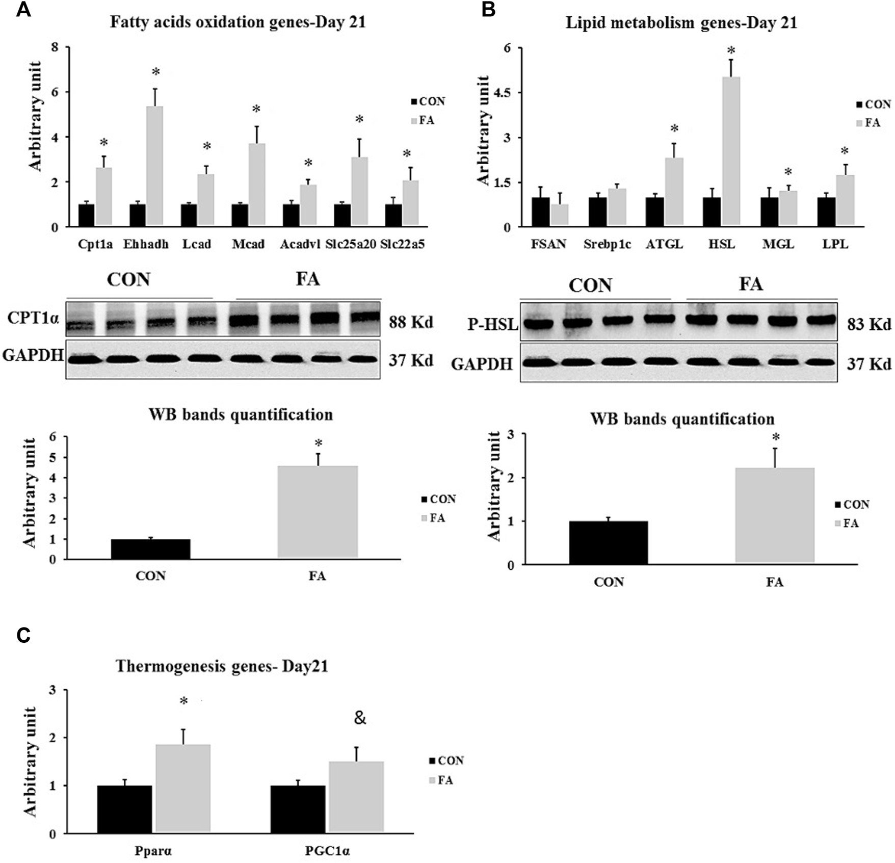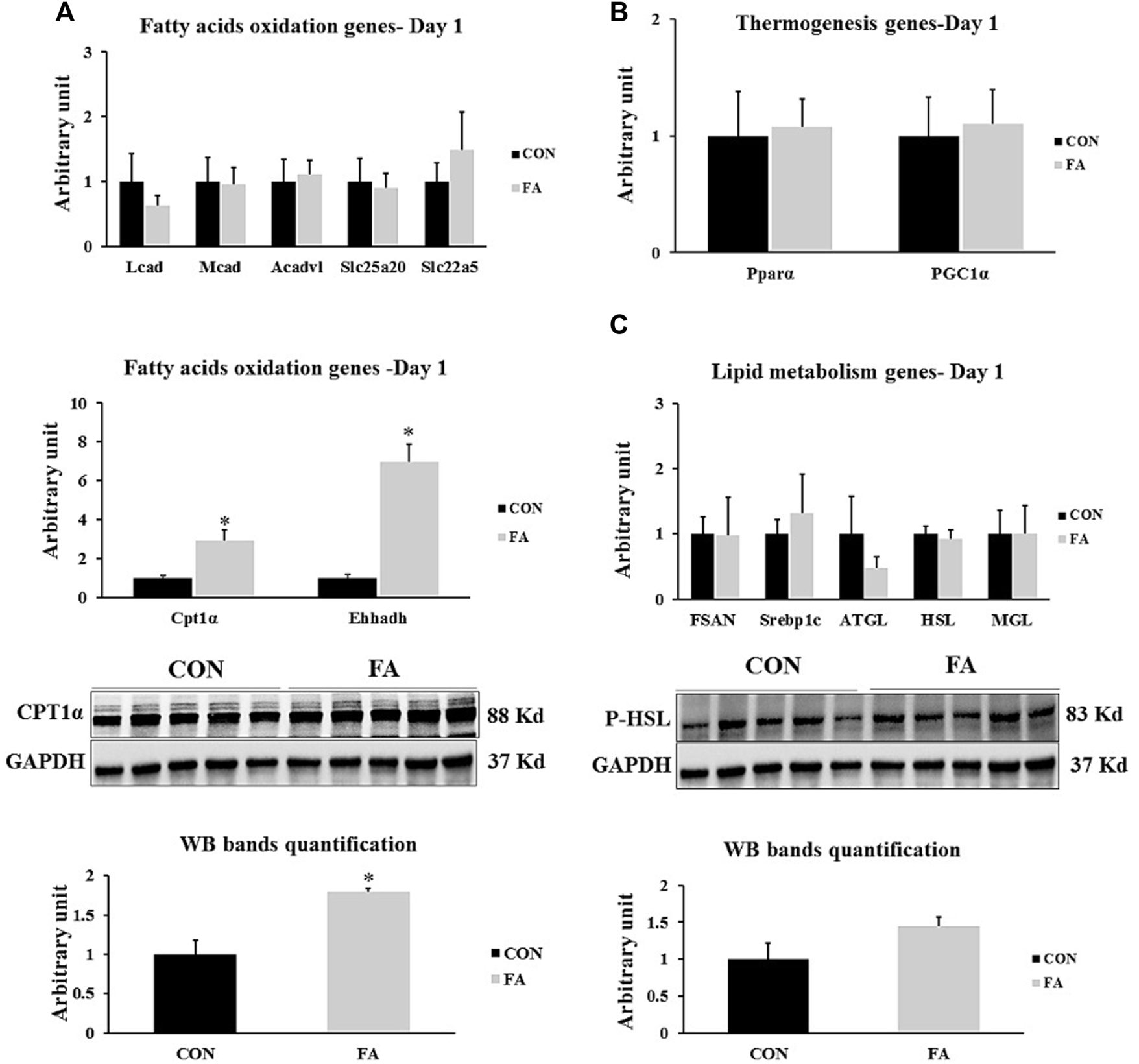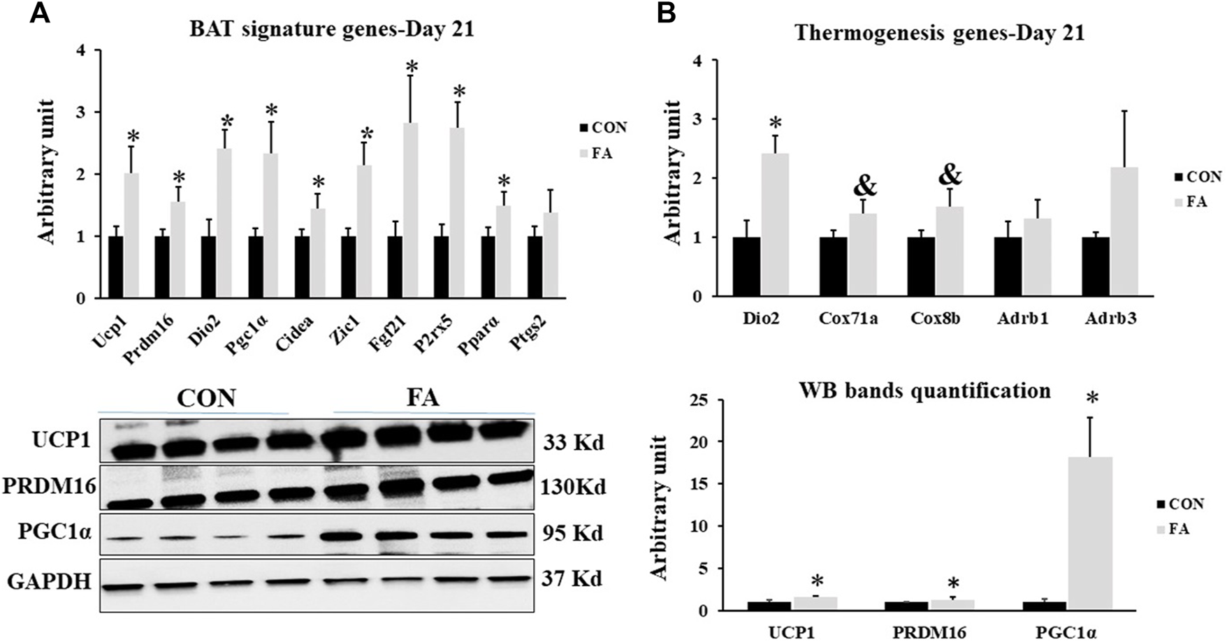 Animals’ handling and care in this study were approved by Institutional Animal Care & Use Committee (IACUC) in University of Arkansas (Protocol # is 19057R). Forty female, 4–6 weeks old, and forty male C57BL/6J mice obtained from Jackson Laboratory were housed for 2 weeks under constant conditions of temperature and humidity for acclimatization. The mice were exposed to unchanged cycle of 12 h of light and darkness and had an access to food and water ad libitum. Mice were checked daily for estrus cycle, and females identified with typical signs of estrus were housed individually with males for breeding. Once the vaginal plug was observed, females were separated and assigned for one of two types of diets. Animals were fed 3.05% fish oil diet enriched with EPA and DHA (FA) (TD.190782) or control diet (CON), replacing the fish oil with soybean oil (TD.160647, Envigo Madison, Wisconsin United States, www.envigo.com). The mice from different groups were maintained on their respective diet throughout the periods of gestation and lactation. Diets composition are explained in (Table 1). Twenty females were euthanized at day 13 of gestation and two fetuses from each mother were randomly selected for gene expression. Due to the small size of embryos at day 13 of gestation, the whole body of each fetus was collected after removing the head. The other twenty mice were allowed to give birth. On day 1 postpartum, pups were euthanized by CO2 inhalation after being weighted. The average number of pups per litter was seven, and only three pups from each litter was selected randomly to be assessed for different parameters. At this time point (D1), livers and all muscles of the thigh were sampled after removing the skin because of the complexity of isolating fetal hindlimb muscles and the insufficiency of individual muscle for RNA and protein extraction. The number of birth and body weights of pups were recorded where the parameters of all the pups per litter were considered in this experiment, and the results of each litter were used for statistical analysis. On the 21st day postpartum, the weaned mice were euthanized using CO2 inhalation and samples from quadriceps muscle (vastus intermedius, vastus lateralis, vastus medialis, and rectus femoris muscle), gastrocnemius muscle, subcutaneous WAT, visceral WAT, and BAT were dissected and frozen in liquid nitrogen for gene expression and western blots analysis. Some of the peri-renal fat, tibialis anterior muscles, Subcutaneous WAT, and visceral WAT were collected and fixed in formalin 4% for histology. Twenty pups, selected randomly, one from each litter, were used for different assessments.