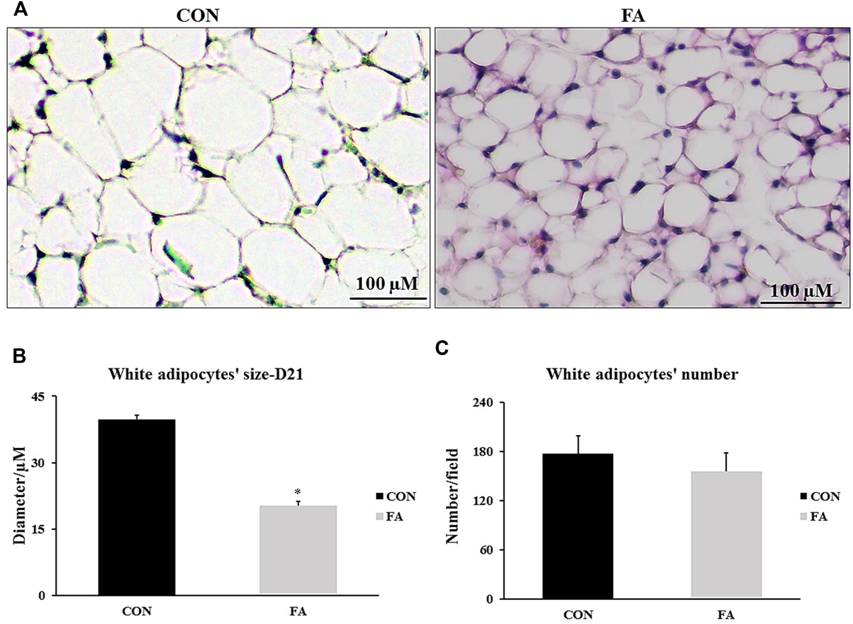 Our results showed that the number of births and body weight of pups at D1 were not affected by FA treatment (p = 0.413476 and 0.252995 respectively). Similarly, although it was not significantly different, FA treated group exhibited a tendency toward decrease body weight (9.36 ± 0.45 g) when compared to control group at weaning (day 21) (10.48 ± 0.53 g) (p = 0.062). In line with that, no significant differences were detected in the ratios of different fat depots including subcutaneous fat, visceral fat, and BAT (p = 0.08897, 0.078182, 0.218379 respectively) among weaned pups coming from mothers fed control or fatty acids enriched diet (Figure 1).