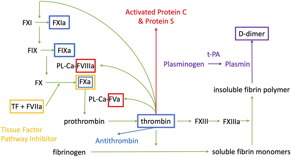 Once the coagulation cascade is activated, the anticoagulant and fibrinolytic systems are also activated, giving rise to complex interactions. Upon thrombin activation, a negative feedback loop induces activation of natural anticoagulants Protein C (PC) and Protein S (PS). PC and PS regulate the activity of activated factor V (FVa) and activated factor VIII (FVIIIa) (Palta et al., 2014). The fibrinolytic system is also activated during coagulation and tissue factor plasminogen inhibitor (TFPI) inhibits activated factor X, tissue factor, and activated factor VII complex (Palta et al., 2014). Thrombin generates antithrombin, which inhibits thrombin and Factors IXa, Xa, and XIa, while endothelial cells produce prostaglandin and nitric oxide (NO) which inhibit vasoconstriction and platelet aggregation (Palta et al., 2014). Plasmin is formed from plasminogen via tissue plasminogen activator (tPA), which then lyses the insoluble fibrin polymer to D-dimer and fibrin degradation products. Thrombomodulin binds to thrombin to prevent clot formation on undamaged endothelium (Palta et al., 2014).