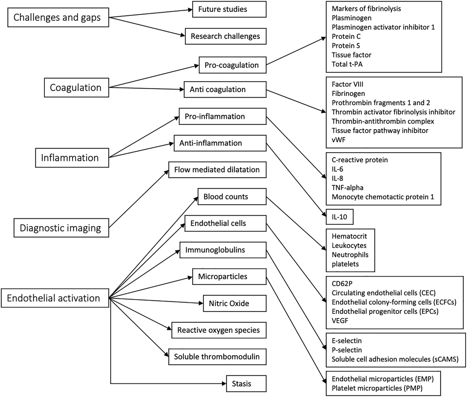 The biomarkers related to coagulation are intuitively linked to the prediction of VTE risk. Therefore, it is not surprising that coagulation arose as an umbrella theme for this qualitative analysis. The tissue plasminogen activator/plasminogen activator inhibitor-1 (tPA/PAI-1) ratio is often considered a marker of ongoing fibrinolysis, similar to the D-dimer. Vascular endothelium promotes fibrinolysis due to release of tPA from vessel wall (Falkon et al., 1992), while PAI-1 is produced by endothelium and liver (Falkon et al., 1992). The linkage of the state of the vessel wall to the coagulation factors complicates the picture and makes it difficult to fully separate endothelial dysfunction/activation from coagulation factors, hence the discussion of these two themes together. For example, shear stress has been linked to increased levels of tPA and PAI-1 (Masoud et al., 2008) and enhanced expression of tissue factor (TF).