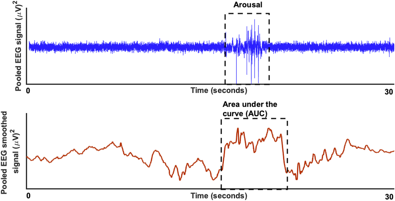 The raw EEG signal (in blue) for a duration of 30 seconds is shown in the top plot with a significant respiratory arousal. In the bottom blot (in red) the smoothed version of the EEG signal is shown to estimate the area under the curve.
