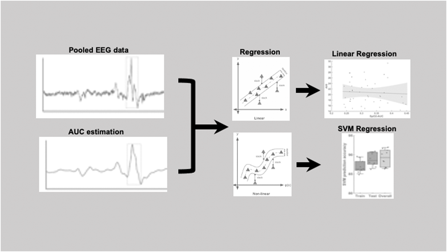 Figure 1 shows an example of a pooled EEG trace in the top plot and the smoothed curve below from which the area under the curve was estimated. The pooling was done to increase the signal-to-noise ratio for the further analyses of area under the curve (AUC). In this study, the technique used was pooling together signals from multiple EEG channels (C3 and C4) weighted by their respective signal-to-noise (SNR) relative to the overall SNR of both the channels. The SNR was estimated in the raw signal, by taking „signal” component as the mean ±2 standard deviation and the „noise” component as the mean ±0,5 standard deviation. The values to indicate the SNR’s for each channel separately were: C3 (24,42 ± 4,84)dB, C4 (22,39 ± 5,51)dB and for the pooled signal SNR (31,23 ± 3,15)dB. The EEG signal was then smoothed based on the 200-time points average (sampling frequency of 200 Hz) equivalent to one second epochs. After the smoothing the area under the curve was determined based on the starting and end point was manually marked for each arousal. The slope was estimated from the starting point to the neighboring peak and followed by estimation of the AUC as illustrated in the schematic Figure 1. Here, we performed both a linear regression as well as a support vector regressor (SVR) analysis, representing a machine learning-based multiple regression method that could associate the observed and trained values and present the correlation coefficient as a prediction (Drucker et al., 1996). Figure 2 shows the procedure from the raw EEG data, estimating the area under the curve (AUC) and then followed by the linear as well as the SVM regression. To create a better comparison, we not only created a correlation between arousal-AUC and SpO2-AUC, but also between AHI and SpO2-AUC.