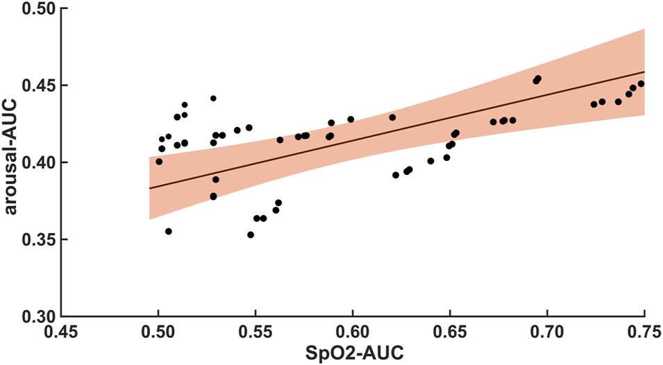 Shows the linear regression results between the arousal-AUC and SpO2-AUC for patients with AHI >30/h of TST. The orange margins indicate the standard deviation for the correlation and the black dots indicate each subject in this group. r = 0.404/p = 0.002/n = 55.