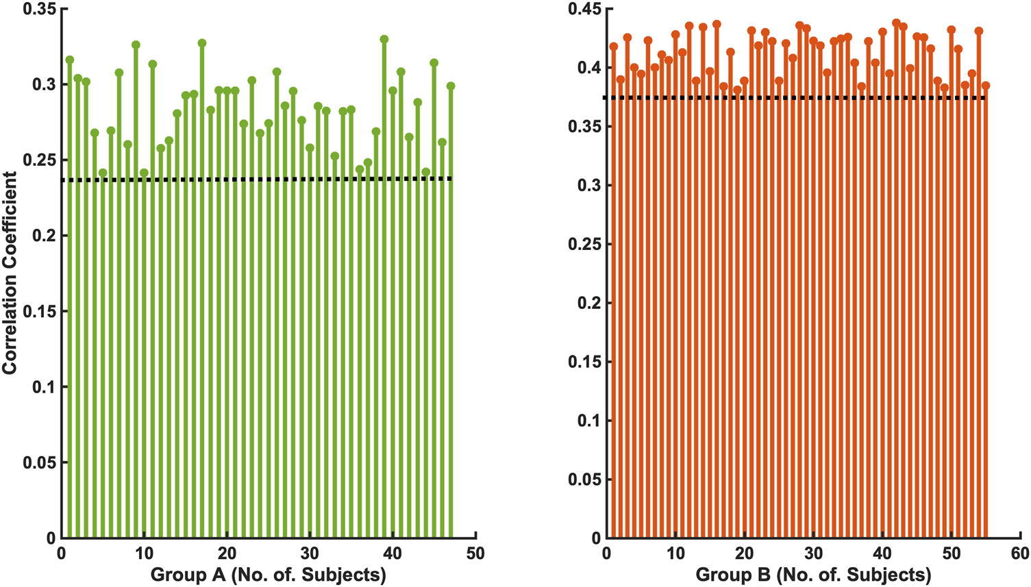 Shows the correlation coefficient between the arousal-AUC and SpO2-AUC for all arousals of every individual of the two separate groups (Group A: AHI 15–30/h of TST; Group B: AHI >30/h of TST).