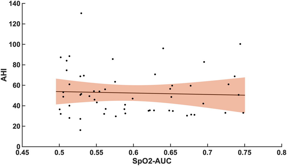 Shows the linear regression results between the AHI and SpO2-AUC for patients with AHI >30/h of TST. The orange margins indicate the standard deviation for the correlation and the black dots indicate each subject in this group. r = -0,0480/p = 0.728/n = 55.