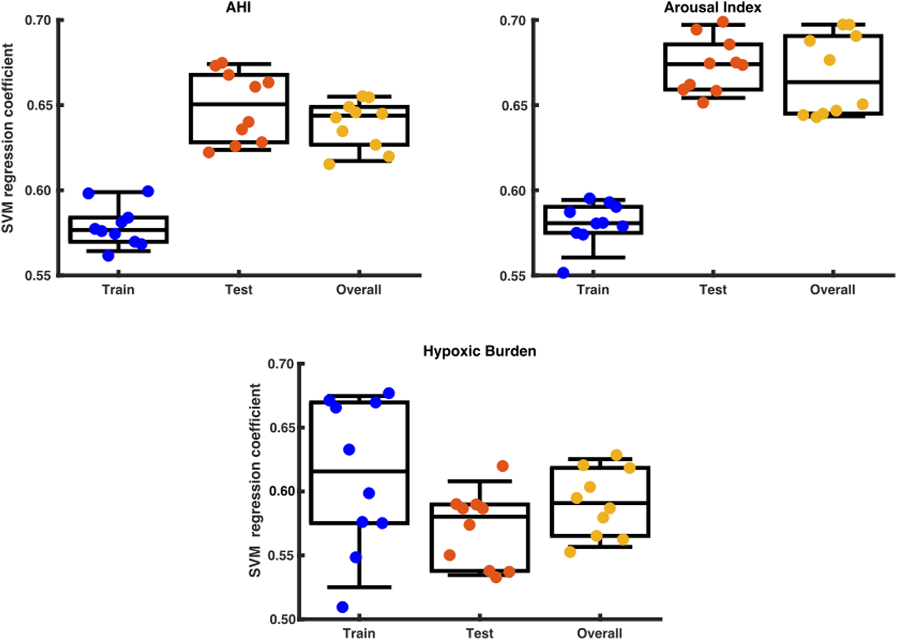 By using a support vector regressor (SVR) analysis with the arousal-AUC metric we could predict the AHI with an correlation coefficient of 0,58 in the training set, 0,65 in the testing set and 0,64 overall. The hypoxic burden showed a correlation coefficient of 0,62 in the training set, 0,58 in the testing set and 0,59 overall. The arousal index had a correlation coefficient to the arousal-AUC metric of 0,58 in the training set, 0,67 in the testing set and 0,66 overall. Figure 8 shows a box plot with the distribution of a data set.