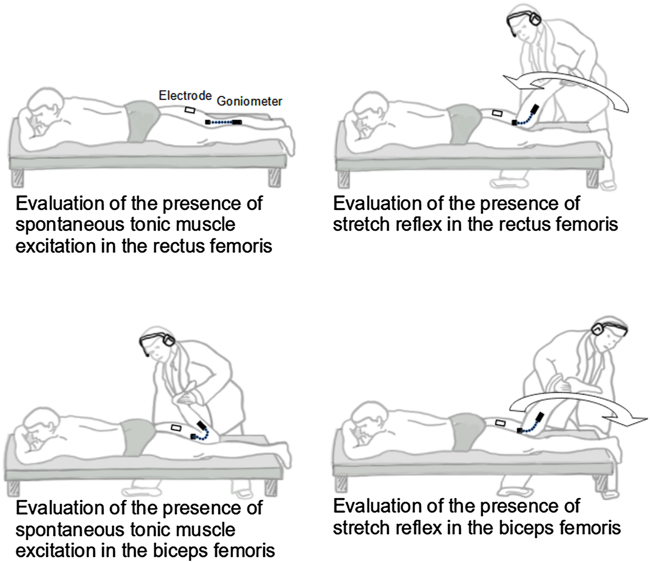 To evaluate the stretch reflex in RF, immediately after completing the 30-second EMG recording aimed at investigating spontaneous tonic muscle excitation, the examiner moved the subject’s leg to maximum flexion in one second. To evaluate the stretch reflex in BF, the examiner moved the subject’s leg to maximum extension in one second. A method developed in our laboratory was used to control the duration of passive displacement. The method is based on acoustic feedback produced by an electronic metronome set at 60 beats per minute and delivered to the examiner via headphones. Therefore, the interval between two consecutive tones corresponded to one second. First, the examiner applied continuous manual knee displacements at a constant pace, so that the leg arrived at the extreme flexed and extended positions in synchrony with consecutive tones (duration of passive movement of one second). Second, when the examiner had synchronized the movement with the tones, the movement was stopped at one extreme position (leg flexed or extended). This position was maintained for 90 s (60 s of relaxation period and 30 s to assess spontaneous tonic muscle excitation, as described above). During these 90 s, the examiner continued to conceptualize the previously executed movement using first perspective motor imagery (Schuster et al., 2011) with the metronome tone as a cue. Third, after the 90 s of motor imagery, the examiner moved the leg so that it arrived at the opposite position in synchrony with the following tone (Marinelli et al., 2013).