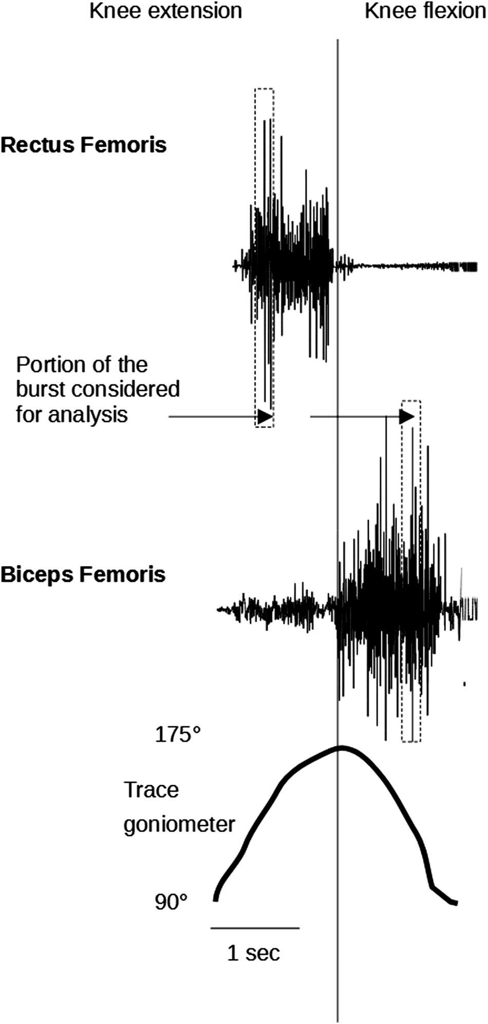 The EMG signals were acquired using wireless EMG equipment (Cometa Srl, Milan, Italy) with a band-pass filter of 1st order in the range of 10–500 Hz and digitized at 2000 samples/s. Raw EMG signals were processed with a band-pass Butterworth filter of 4th order bidirectionally in the range of 20–500 Hz and full wave rectified With this technique, the transfer function of the filter is real, and, therefore, no delay or phase distortion is applied to the signal to be filtered. During passive movements, knee joint angle was continuously acquired using a twin-axis electronic goniometer (TSD130b, Biopac System Inc., United States).