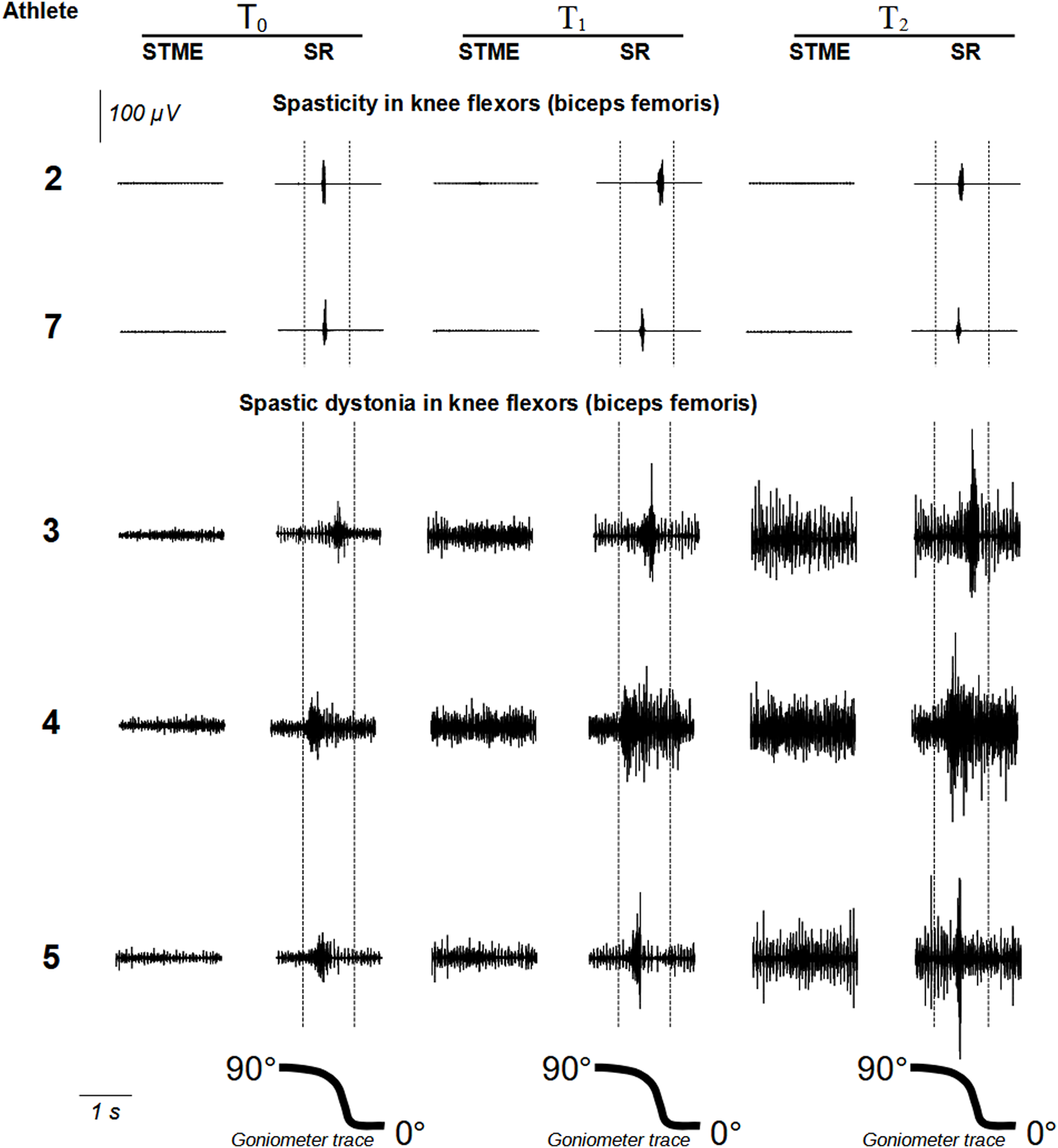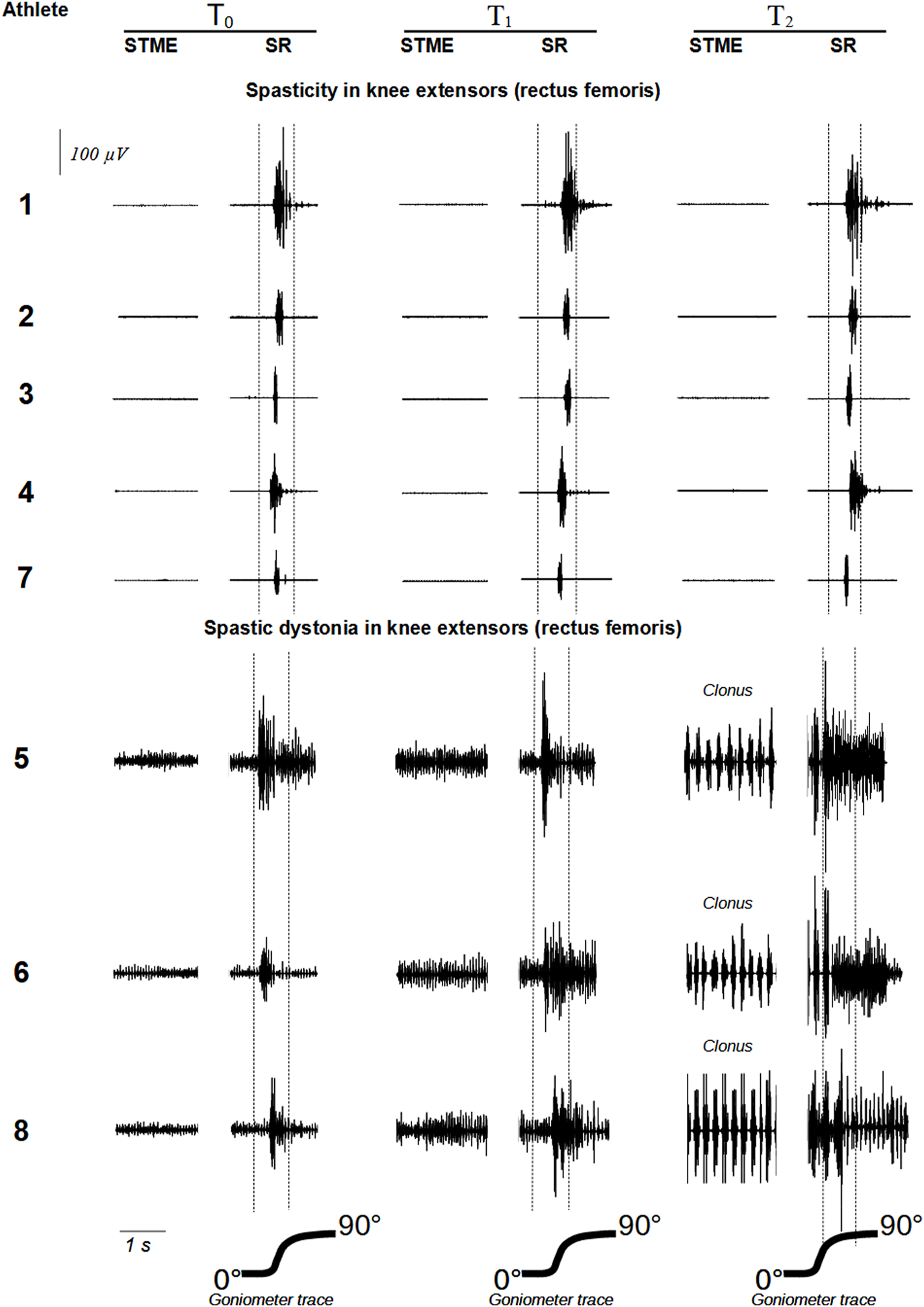 show raw EMG signals from rectus femoris and biceps femoris, respectively. Abbreviations: STME (spontaneous tonic muscle excitation); SR (stretch reflex).