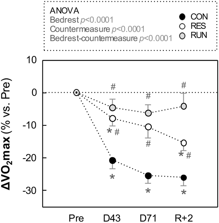 With HDBR, O2max declined by 26% in CON (from 32.6 ± 2.2 ml kg−1. min−1 at Pre to 24.2 ± 1.9 at R + 2). Of note, most of this decrease (−21%) was already achieved at D43.
