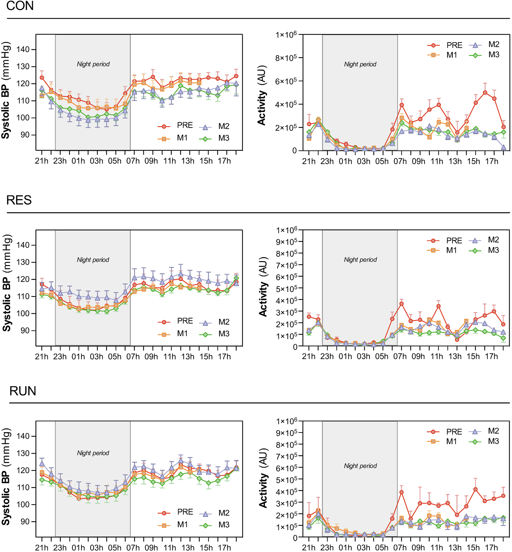 Circadian patterns of systolic blood pressure and physical activity. Recordings were performed using the SOMNOtouch™ device over 21 h, before HDBR and at the end of each month (M1, M2, and M3). The night period was 22:30–06:30. The sample size was n = 8/CON, n = 7/RES, n = 7/RUN. Data are presented as the mean ± SEM.