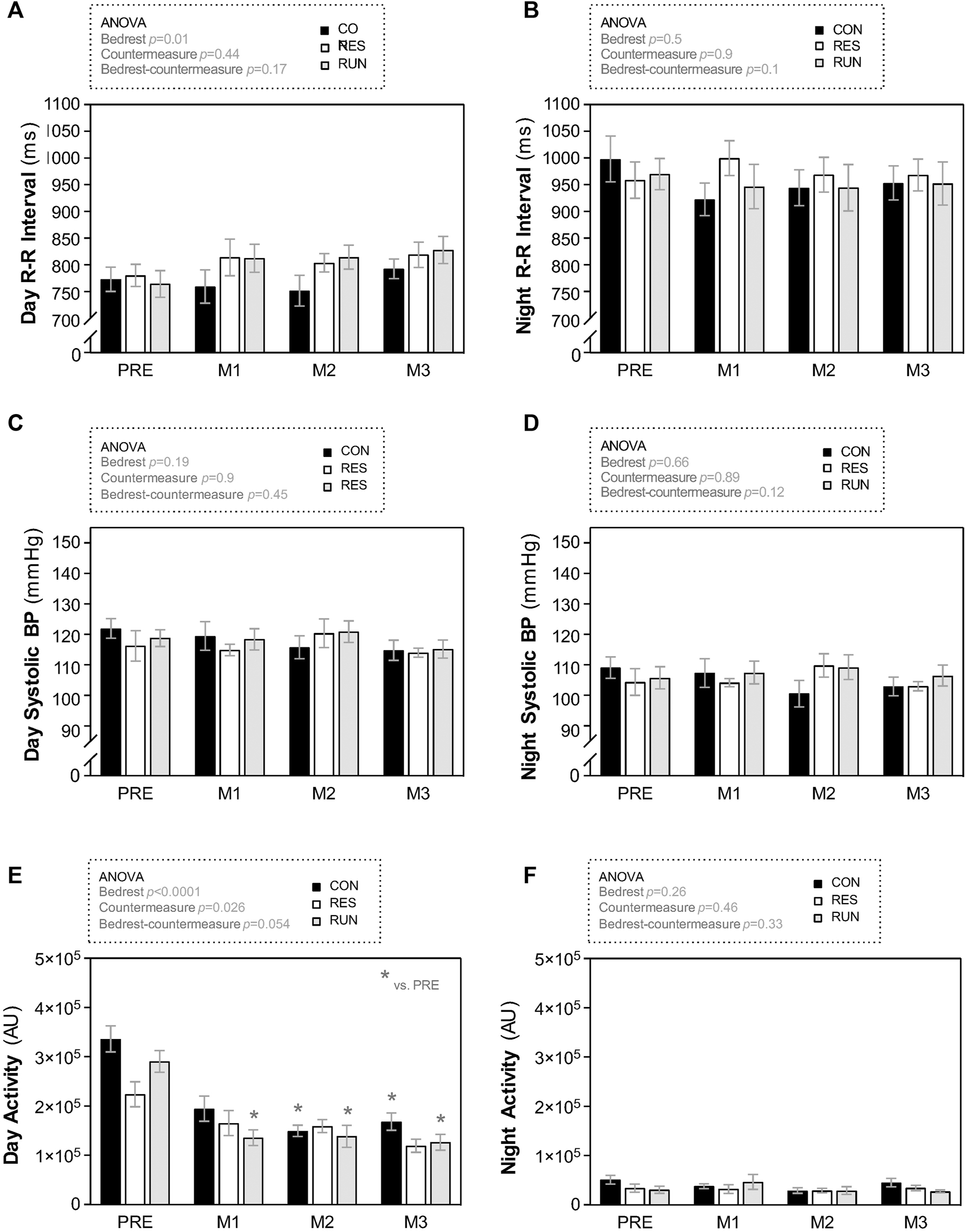 The R-R interval and SBP, as estimated by “day” and “night” mean values, did not differ between groups during bedrest (Figures 7A–D).