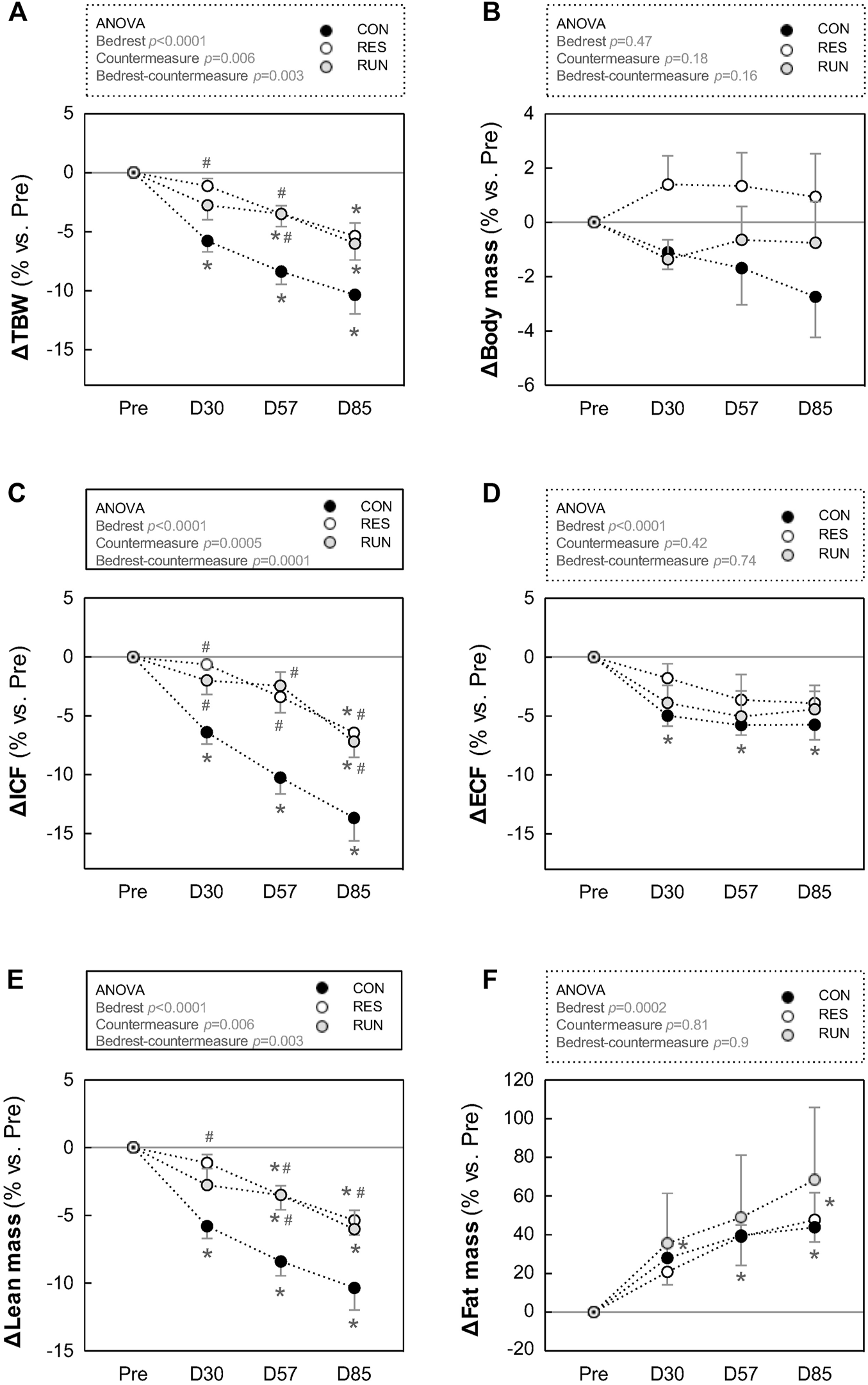 Evolution in fluid compartments, body mass, and body composition during HDBR. Fluid compartments (A,C,D) body mass used for bioimpedance measurements (B), and body composition (E,F) were estimated by bioimpedance measurements using a multifrequency impedance device. The subjects were weighed prior to measurement, and body mass data used for calculations. The sample size was n = 8/CON, n = 7/RES, n = 7/RUN. Data are presented as the mean ± SEM. *p < 0.05 vs. Pre; #p < 0.05 vs. CON.