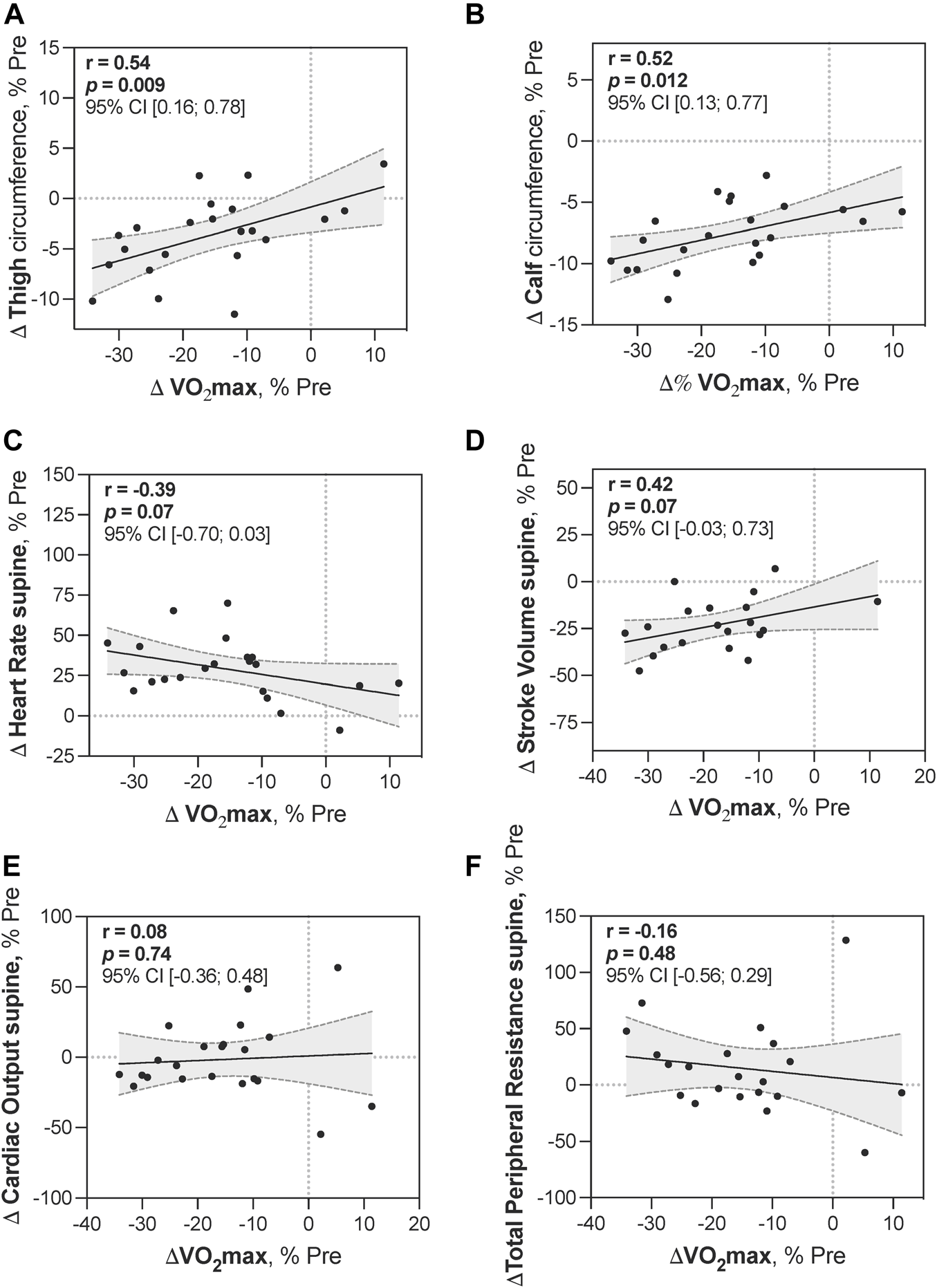 Data are presented as the mean ± SEM. Three-way ANOVA or 2-way ANOVA for repeated measures was used, with bedrest (measurement time points) and position (supine and tilt) as the within-subject factors and the countermeasure (CON, RES, and RUN) as the between-subject factor. Statistically significant differences were further analyzed by two-sided pairwise multiple comparisons with Sidak correction. Relationships between variables were examined using the Pearson correlation coefficient (r). Orthostatic tolerance (finisher and nonfinisher numbers across groups) was analyzed using the chi-square test. Differences were considered statistically significant when the adjusted p ≤ 0.05. Analyses were performed using Prism GraphPad 9.0.2.