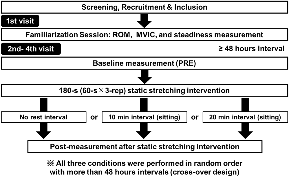 Although there have been many studies on the acute effects of SS interventions, few studies have investigated the time-course changes of an SS intervention. The time course of changes in stretch-induced force deficit is essential knowledge for athletes and coaches to understand the timing of incorporating an SS intervention during a warm-up routine. However, some previous studies have investigated the time course of changes in stretch-induced force deficit. For example, Mizuno et al. (2014) reported a decrease in maximal voluntary isometric contraction (MVIC) recovered within 10 min after a five 60-s SS intervention of the plantar flexors. Similarly, Ryan et al. (2008b) showed that the plantar flexors’ four 30-s, eight 30-s, and sixteen 30-s SS interventions decreased MVIC significantly, but this was recovered within 10 min. However, Konrad et al. (2019) found a significant decrease in MVIC at 0, 5, and 10 min after an SS intervention of the plantar flexors. However, Budini et al. (2020) showed that MVICs could promote the recovery of muscle spindle sensitivity. Thus, the repeated MVIC measurements in previous studies (Ryan et al., 2008b; Mizuno et al., 2014) could have influenced the muscle strength recovery after the SS interventions. Therefore, it is necessary to investigate the time course of changes after an SS intervention in detail, without including repetitive MVIC measurements, by, for example, measuring every time point in a crossover design.