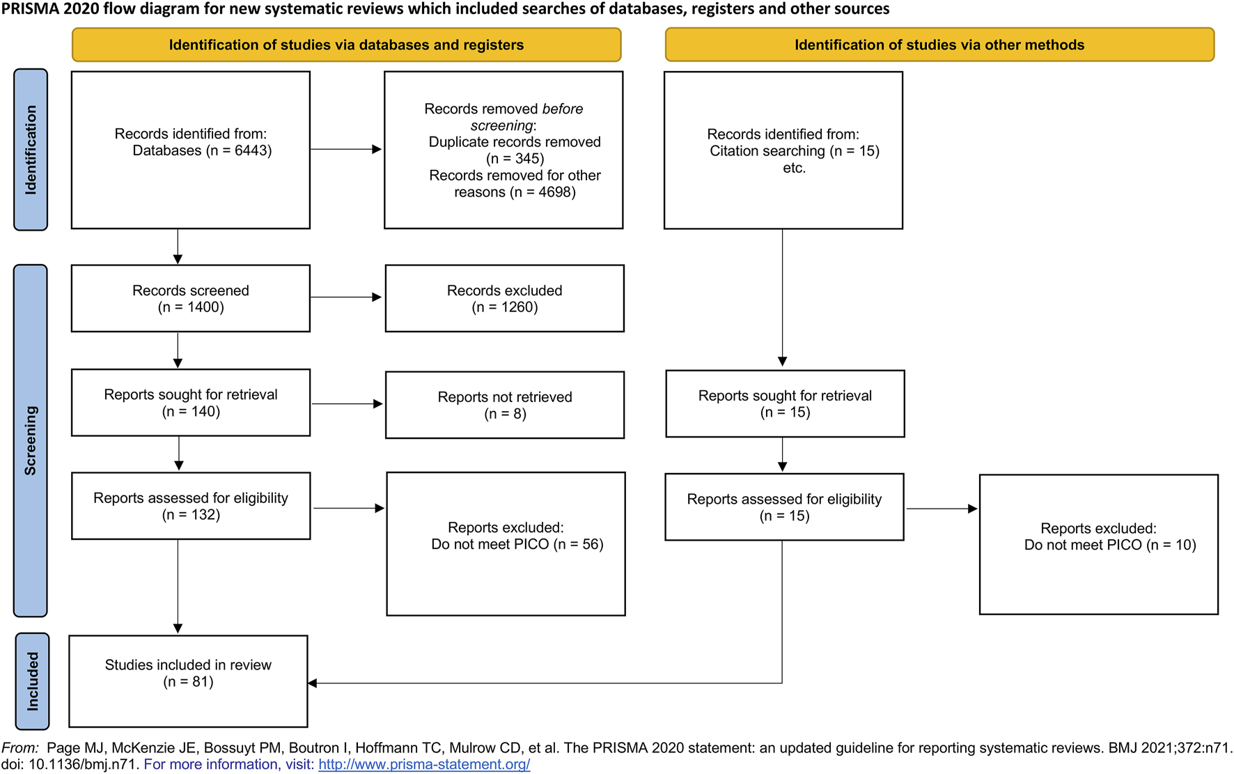 A total of n = 6,443 studies were identified from the main search strategy (Table 1) in databases and registers. After removing duplicates (n = 345) and for other reasons (n = 4,698), a total of n = 1,400 studies were used for the screening process. During this process, a total of n = 1,316 were excluded because they did not meet the PICO scheme or due to other reasons, and n = 8 reports were not retrieved. This resulted in the inclusion of n = 76 studies from databases and registers. A total of n = 15 studies were retrieved from citation searching. From these n = 15 studies, a total of n = 10 studies were extracted because they did not meet the defined PICO scheme, resulting in an inclusion of n = 5 studies from other methods. Figure 1 depicts the systematic search strategy and selection process.