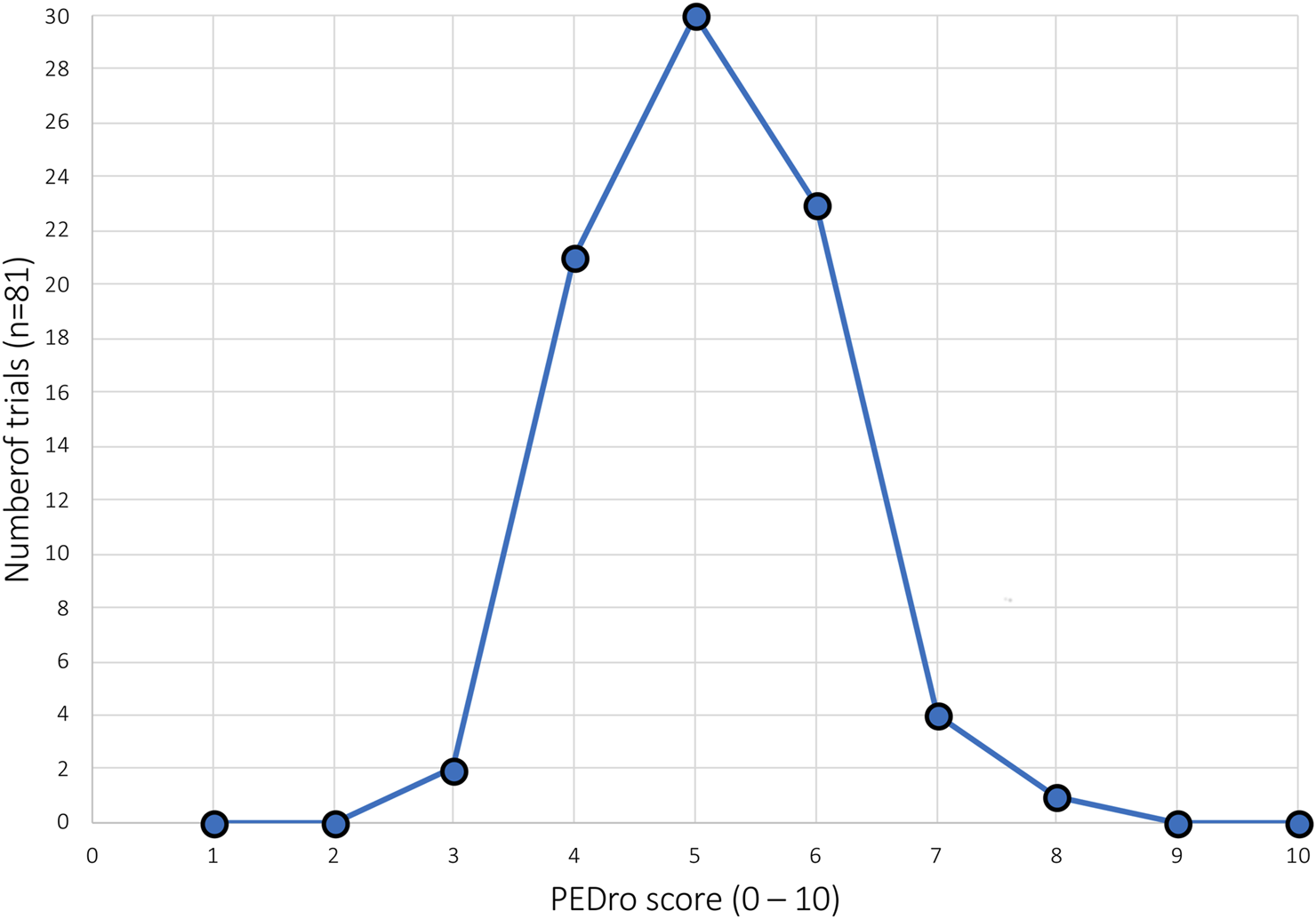 The included clinical trial dates ranged from 1982 to 2021. A total of n = 81 studies were included in the final analysis to evaluate the methodological quality over the past 40 years. Notably, no study was already listed in the PEDro database.