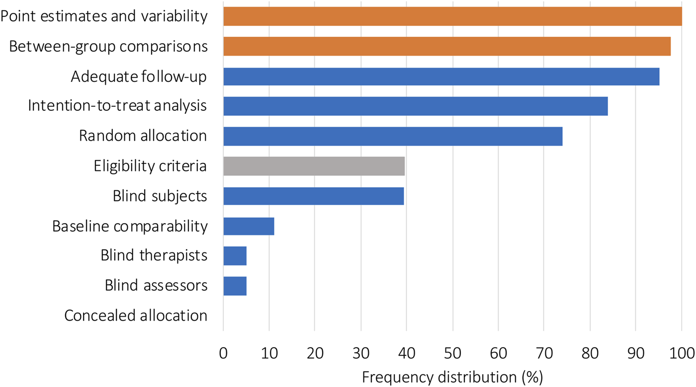 FIGURE 4. Relative frequency distribution of all included studies for each PEDro item. Orange bars represent items 10 and 11 of the PEDro score, which represent the interpretability of the data. Blue bars represent items 2–9, which are used to evaluate internal validity. The gray bar represents item 1, which evaluated external validity and was not used to calculate the total PEDro score.
