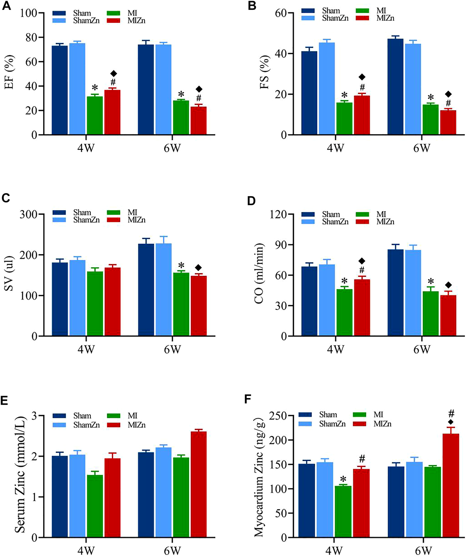 Cardiac functions and zinc levels in eight groups. Panels (A–D) show the change of EF, FS, SV, CO, respectively. Panels (E,F) show the change of serum and myocardium zinc concentrations, respectively. All of the data were shown as Mean ± SEM. *p < 0.05, MI vs. Sham; ◆p < 0.05, ShamZn vs. MIZn; #p < 0.05, MIZn vs. MI.