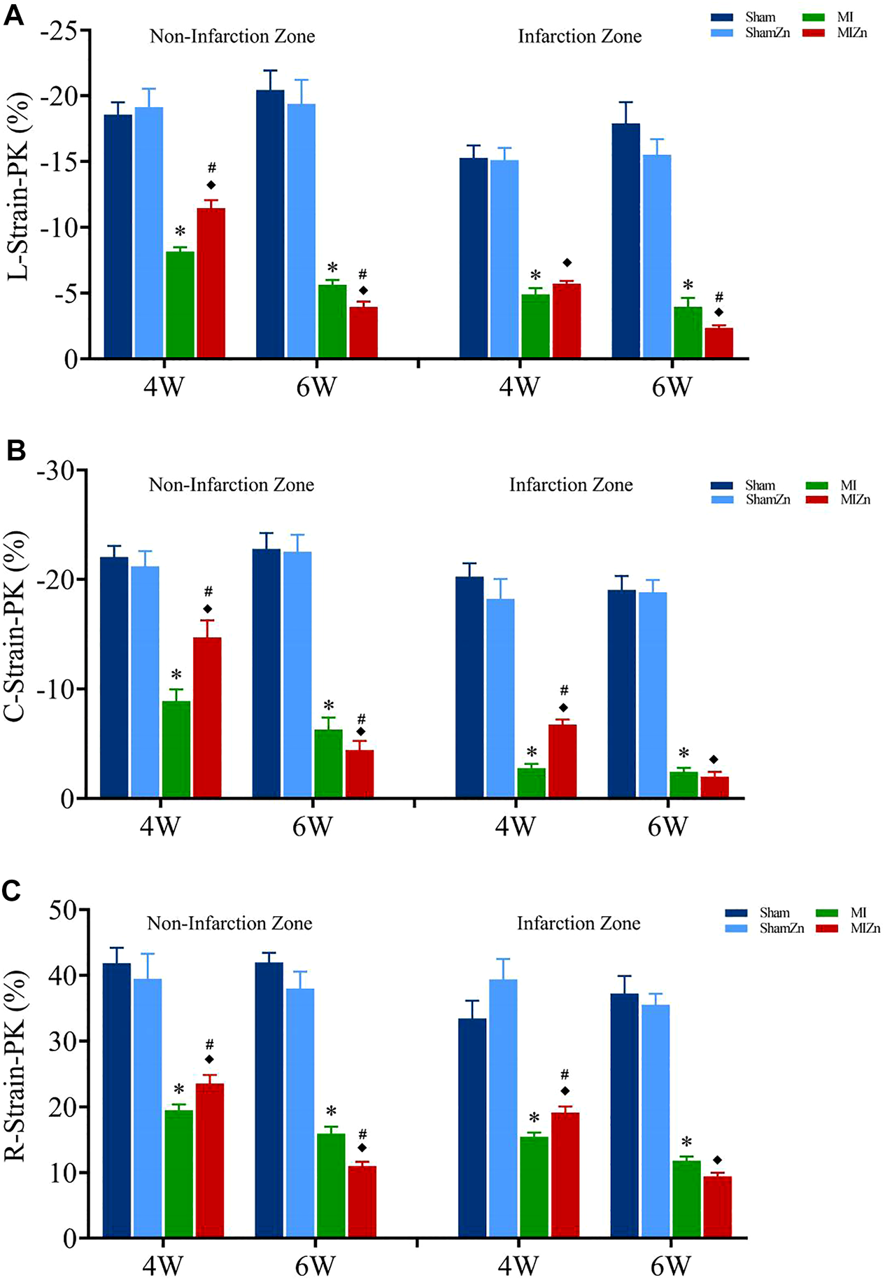 Strain peak values in the longitudinal (A), circumferential (B) and radial (C) directions of myocardial infarction zone and non-infarction zone in eight groups, L: Longitudinal, C: Circumferential, R: Radial. All of the data were shown as Mean ± SEM. *p < 0.05, MI vs. Sham; ◆p < 0.05, ShamZn vs. MIZn; #p < 0.05, MIZn vs. MI.